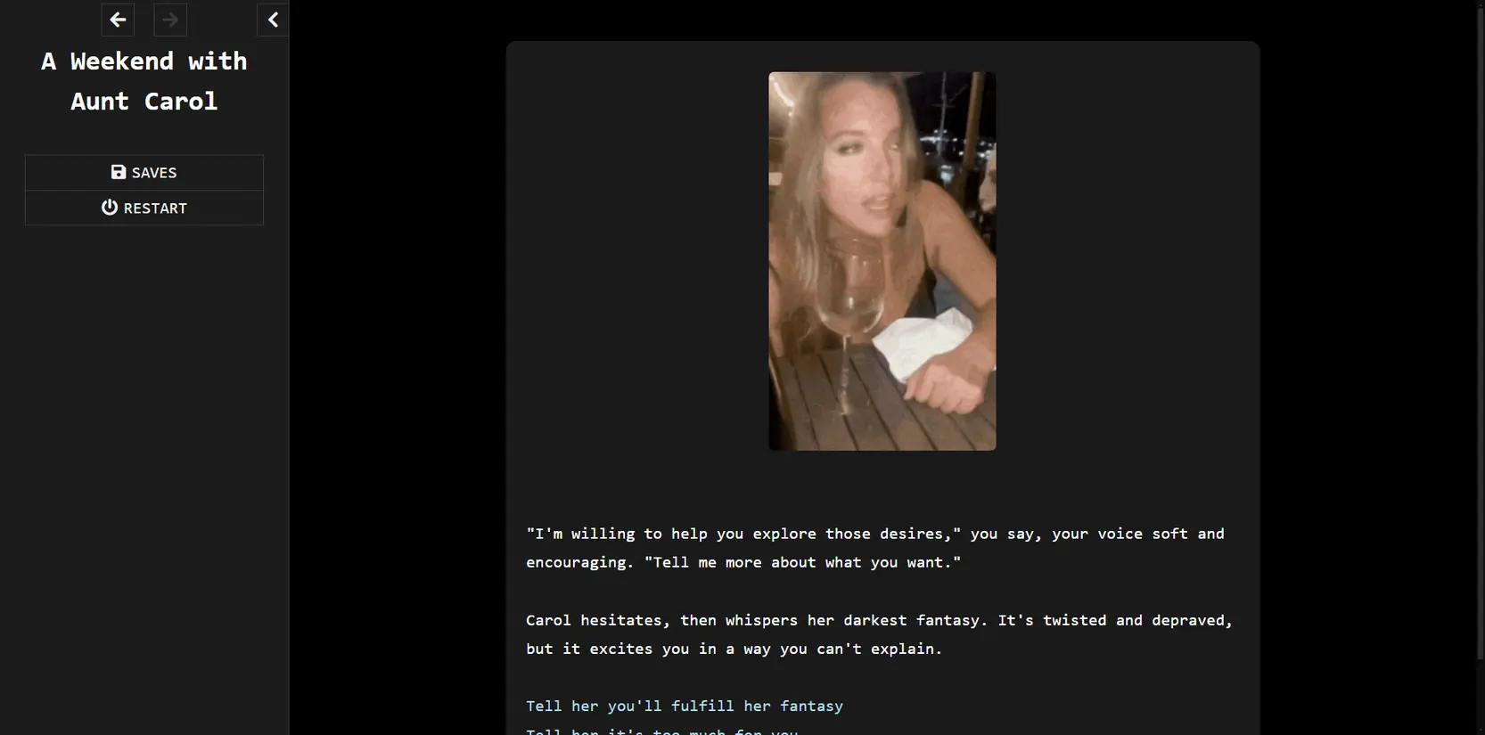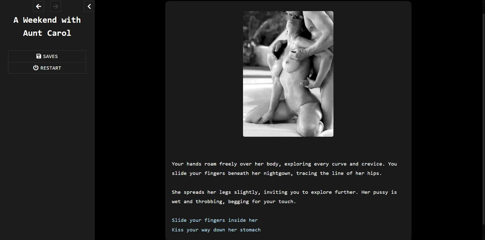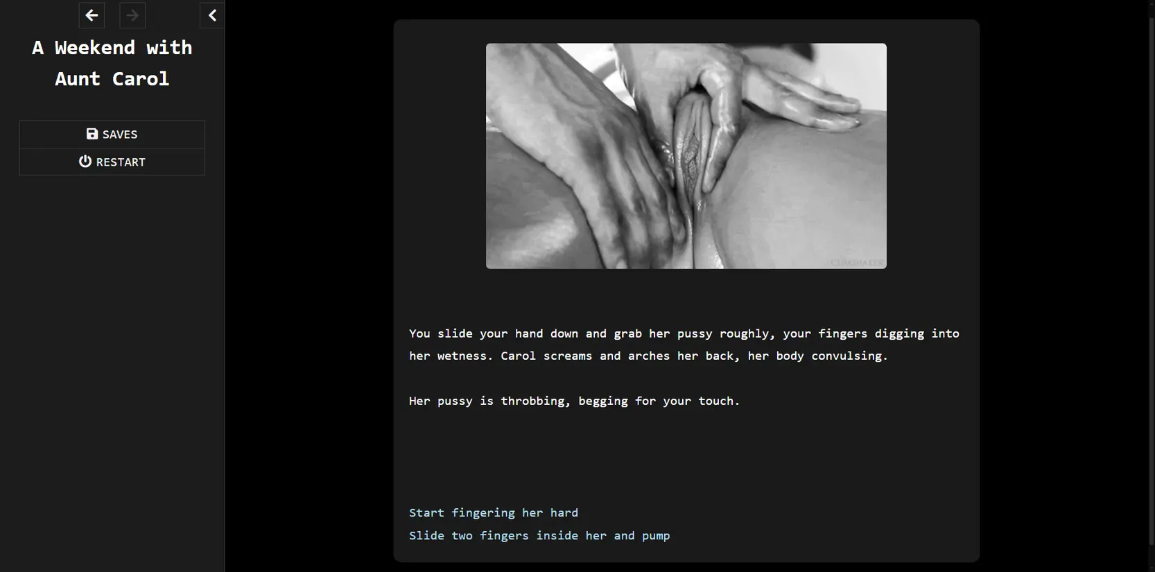 About The Game: A Weekend With Aunt Carol is a porn game made on HTML game engine. This game is rated M and meant for adults with explicit contents and strong language. It is advised to read the tags to get an idea about the game. The current available version is v.A Weekend With Aunt Carol. THe contents of the game is Uncensored. A Weekend With Aunt Carol is developed and distributed by ChromaK, Please support ChromaK if want the development of A Weekend With Aunt Carol game going or want to see more new games from them in future. The download links are crawled and gathered from various public sites. We do not host/modify or alter the contents. The uploader is responsible for the DMCA.