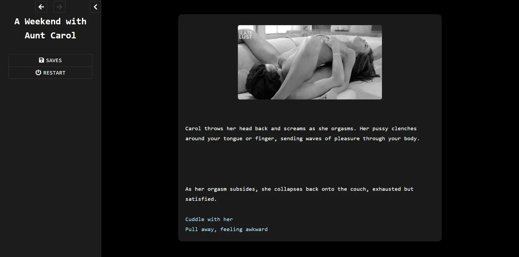 In “A Weekend With Aunt Carol” you play as a young man whose mom has to leave for a business trip and the player is invited to spend a weekend with his Aunt Carol. Things take a turn when you notice her sensual vibes, the player is invited to discover the true desires and passions of Aunt Carol.