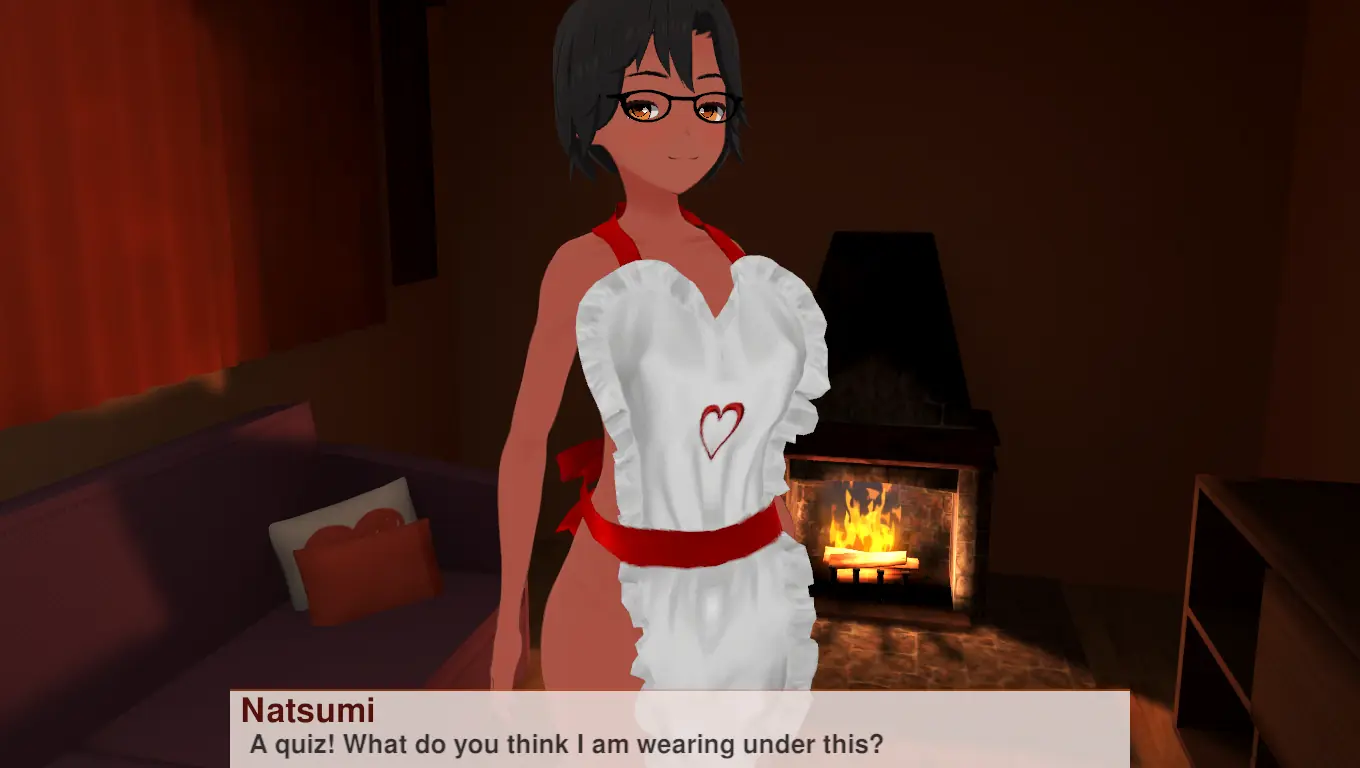 After a long day of work you return home to find your girlfriend (wife?) waiting. She looks very cute in her apron but you feel like a dinner together might not be the only thing on her mind. As the sun sets and the rain starts to batter the windows, you sit down on the sofa and wonder what the night has in store for you.