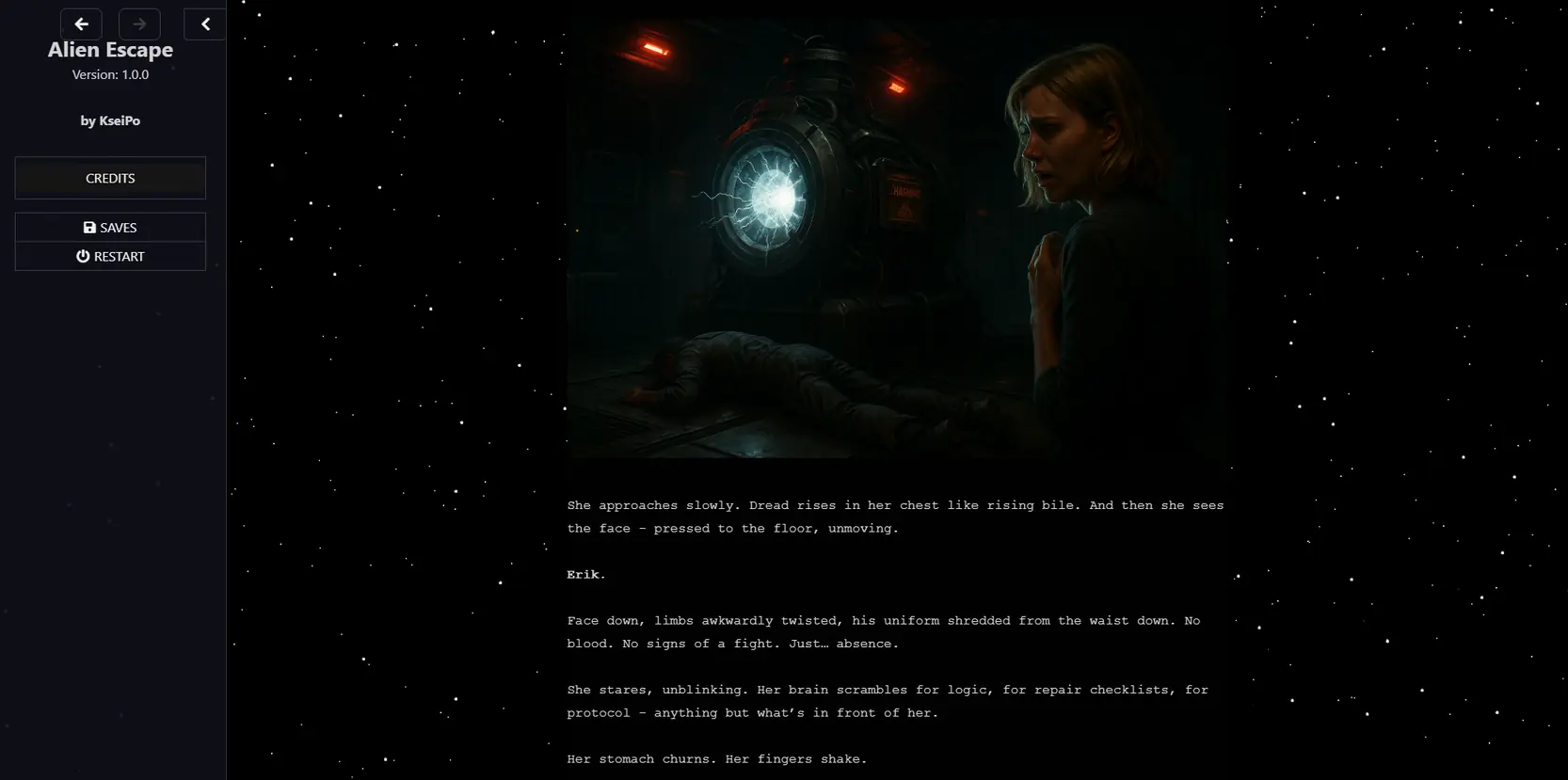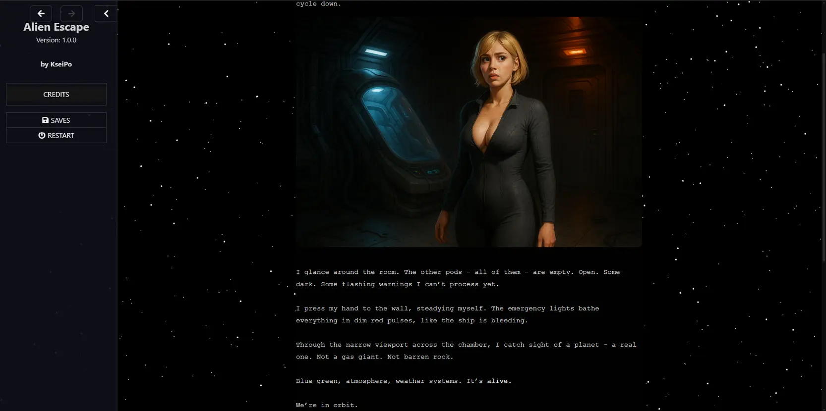 Alien Escape is an atmospheric, narrative-driven sci-fi horror experience with mature themes, branching paths, and multiple endings.