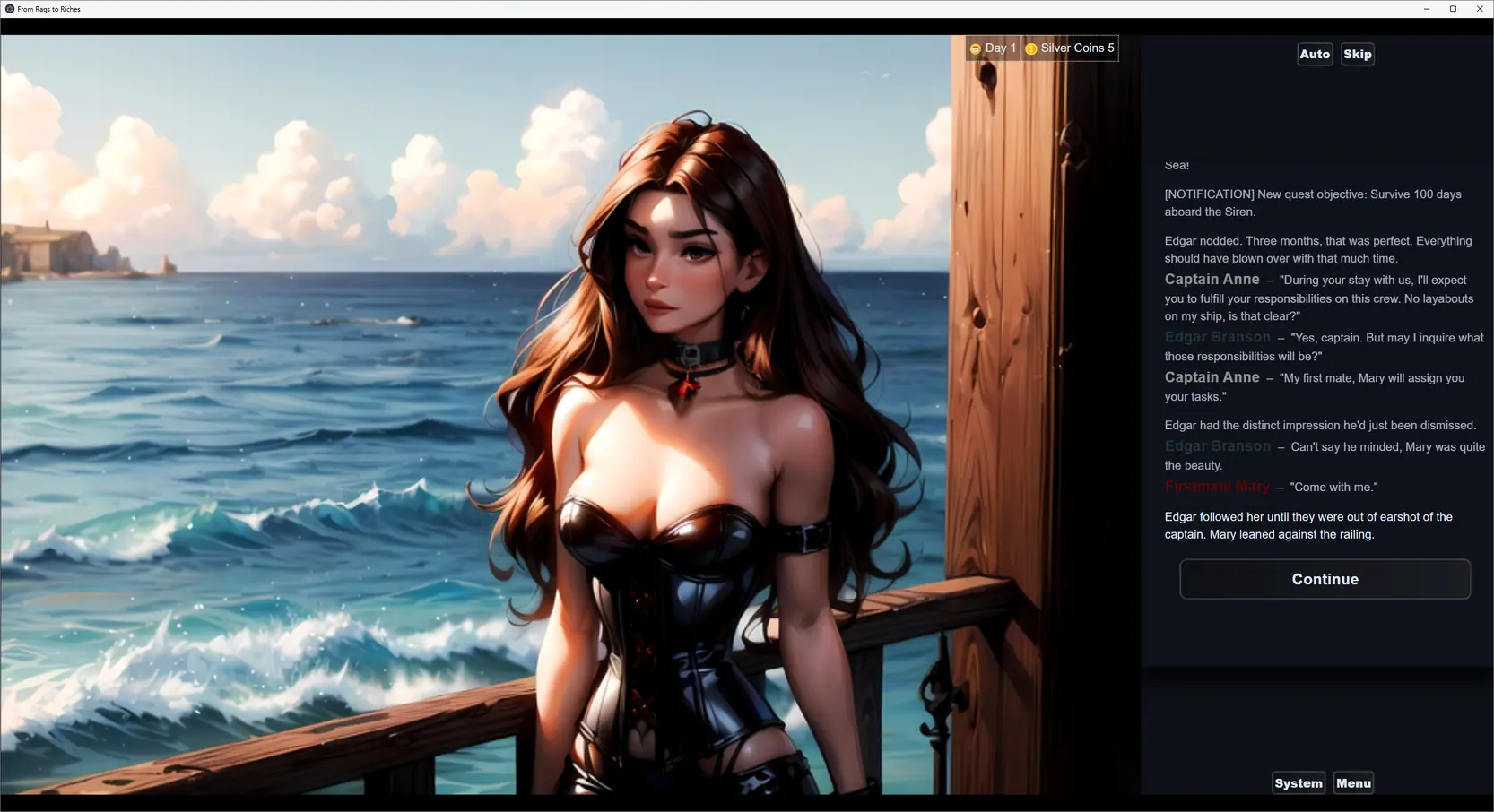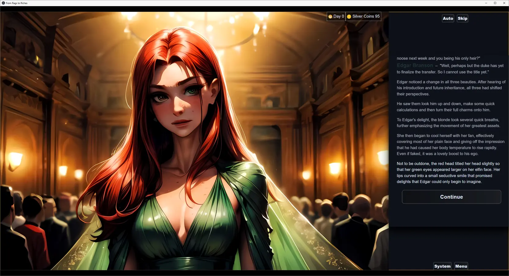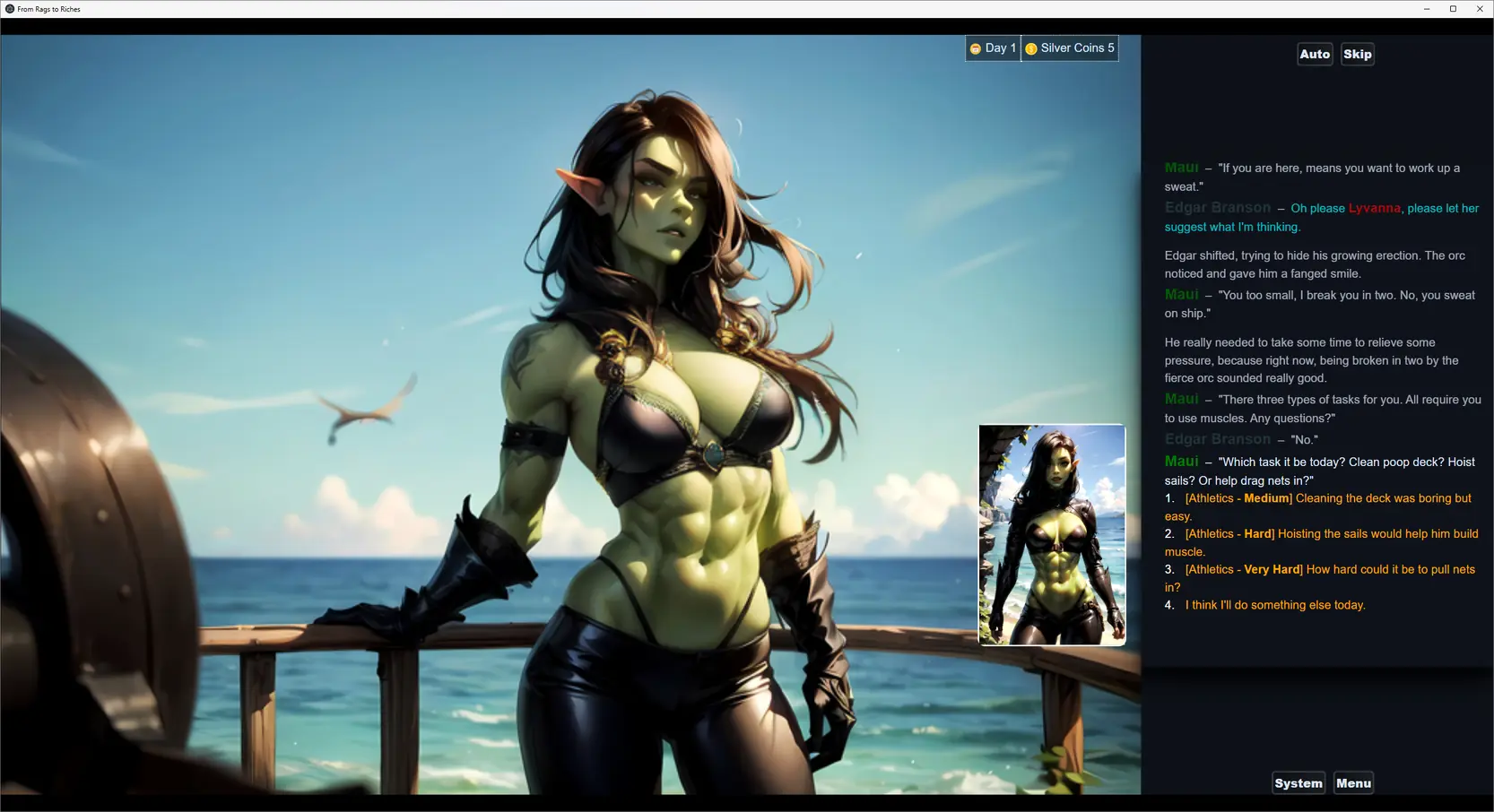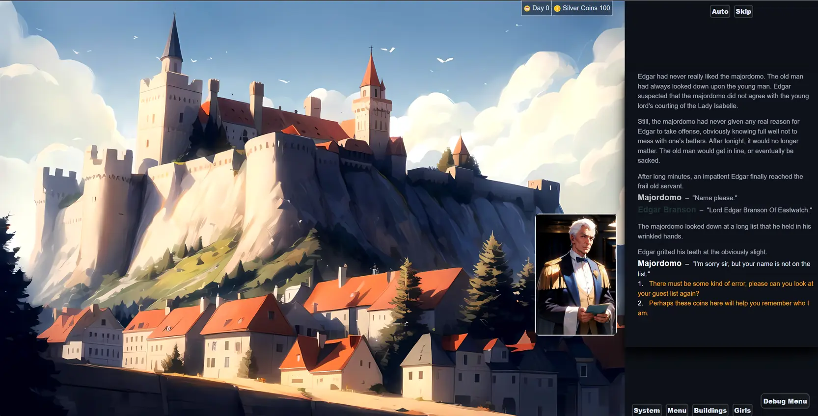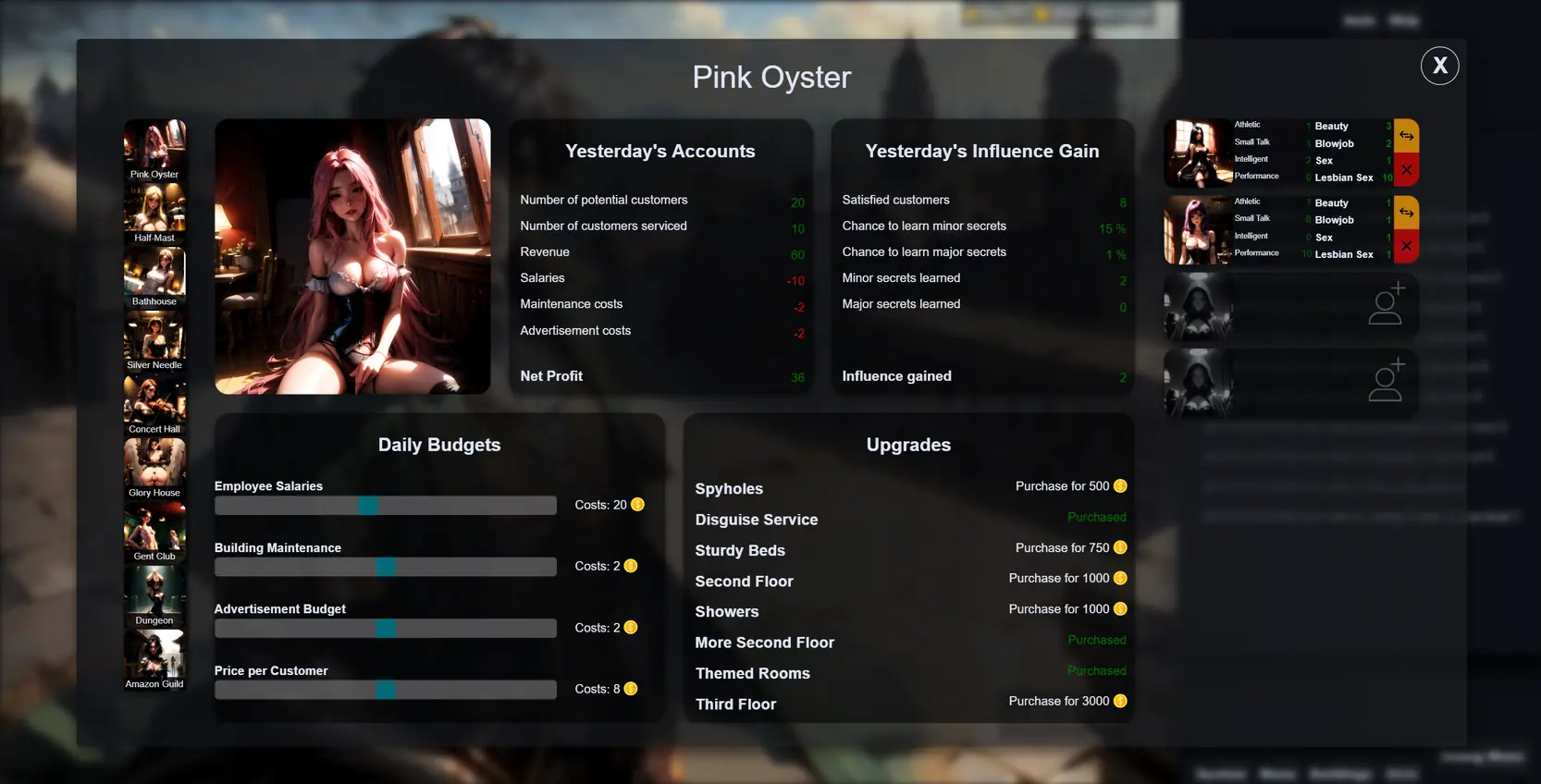 The game has a few interesting mechanics. Throughout the story you get to upgrade Edgar’s roguish skills as well as sexual abilities. You then get to use these to handle challenges before you and progress throughout the story. Furthermore, later in the game you get to establish multiple business of the.. let us say, catering to lecherous citizens of Tego, the main city. You must maintain, grow and upgrade these businesses with eye on your income and expenses as well as your business’ reputation. Lastly you must hire and find girls to work your fine establishments.