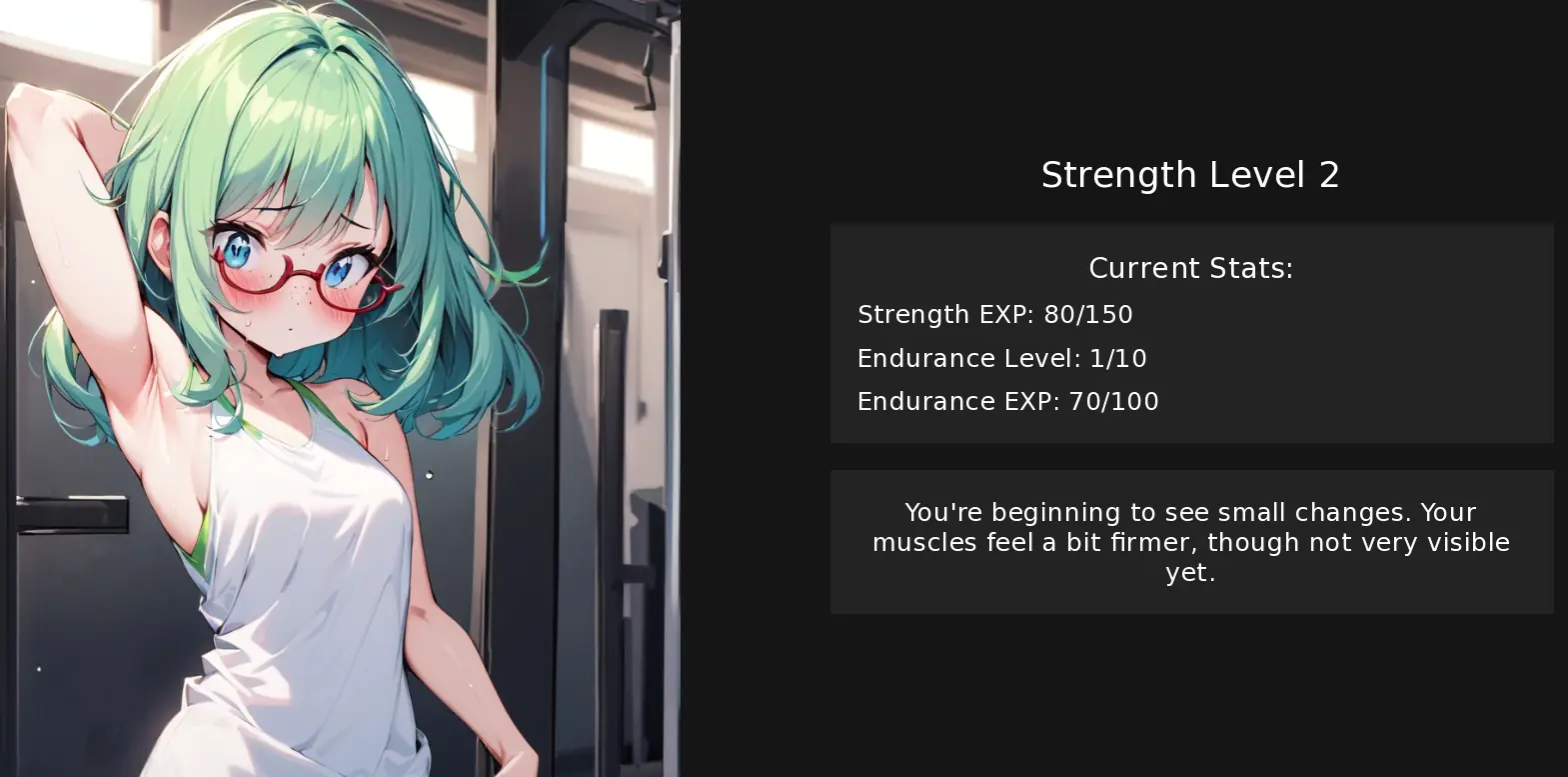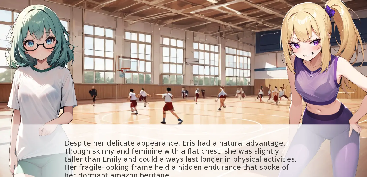 This is my first project at Renpy. You play as Emily, a girl who, tired of the derogatory comments of Eris, her high school classmate, reveals herself and challenges her that she can be a girl with big muscles and a voluptuous body.