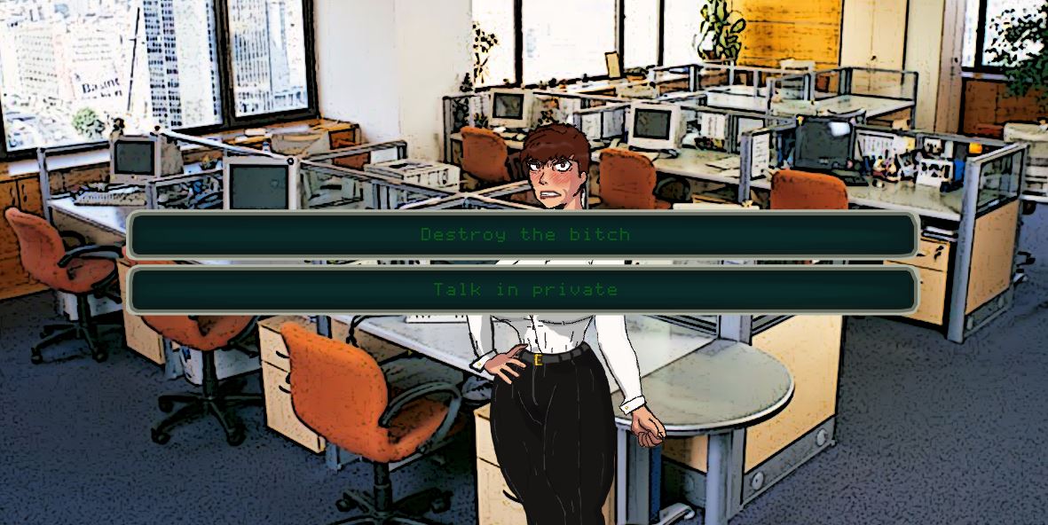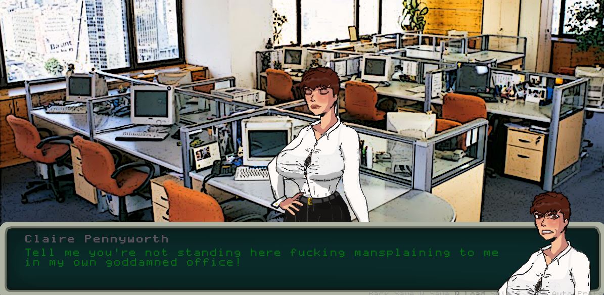 Bitch Breaker is a 1980’s themed “Slave Trainer”, a genre of games popularized by a very gifted artist and creator named Akabur wherein the game’s protagonist “trains” another character in sexual slavery, most often against their will. In Bitch Breaker the player takes on the role of an unpaid intern named Max Power who is forced to work for the summer at a sleezy 80’s megacorp where he trains his cruel, overbearing boss, the titular Bitch.