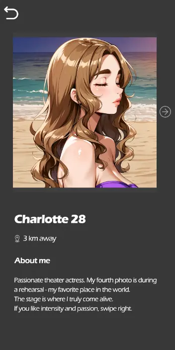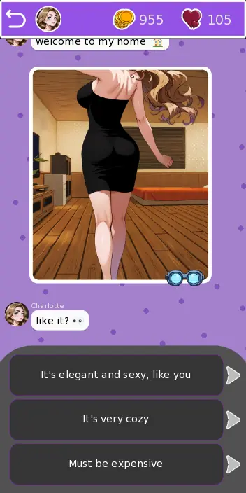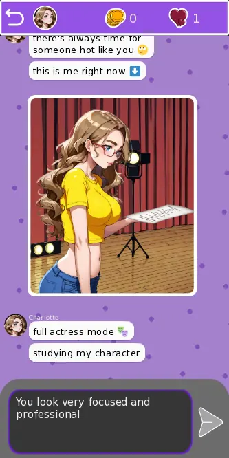 After joining a dating app, you match with Charlotte, a brown-haired, blue-eyed woman with a bold, straightforward personality. As the chat unfolds, her direct charm pulls you in, and your choices decide how the relationship develops. Along the way, you’ll earn coins to unlock her most intimate photos and special moments. But Charlotte isn’t alone… her best friend Iris also plays a role in the story, adding new layers and surprises to the experience.