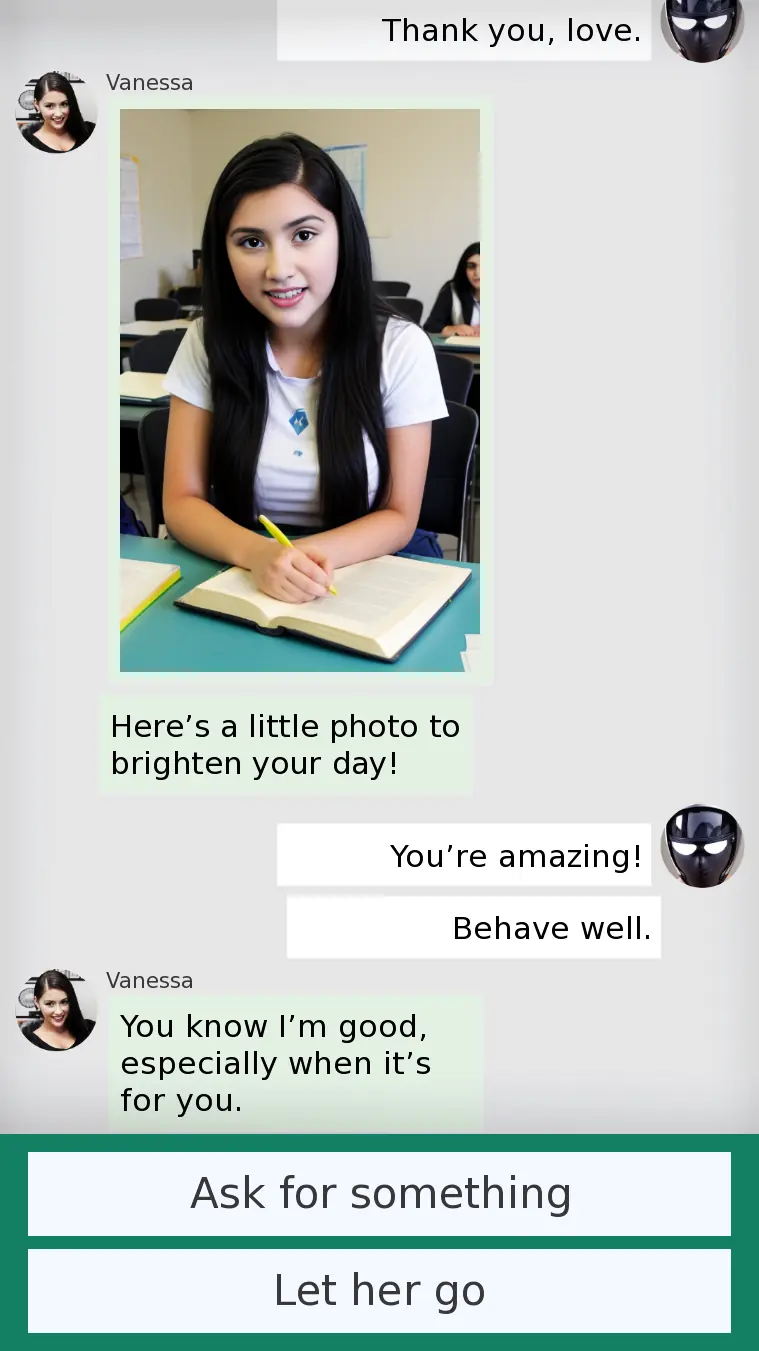 Cheat Chat is a minimalistic chat simulation game where you interact with Vanessa, your sweet, accommodating, and tender girlfriend. The game features real-life AI-generated images and a strong NTR theme. It is uncensored and available in both English and Spanish. Currently, it is at version 0.02 and offers a unique, immersive experience for fans of this genre.​