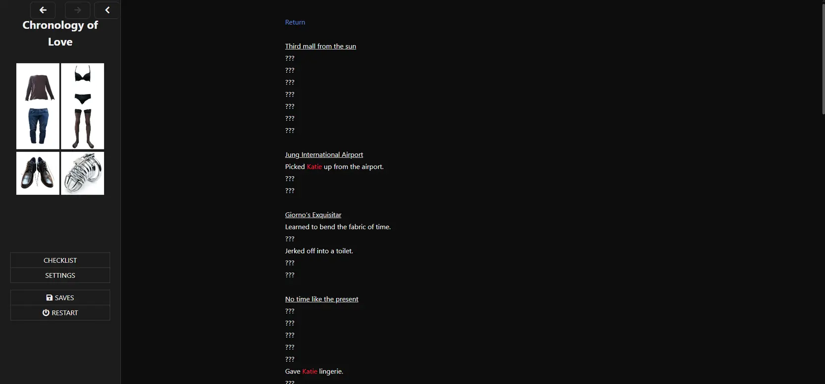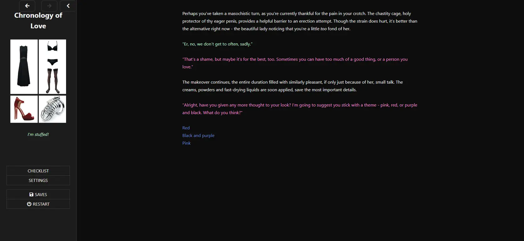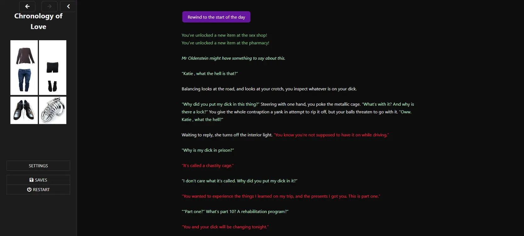Chronology of Love is an erotic interactive fiction HTML game, revolving around the sissification of you, the protagonist.