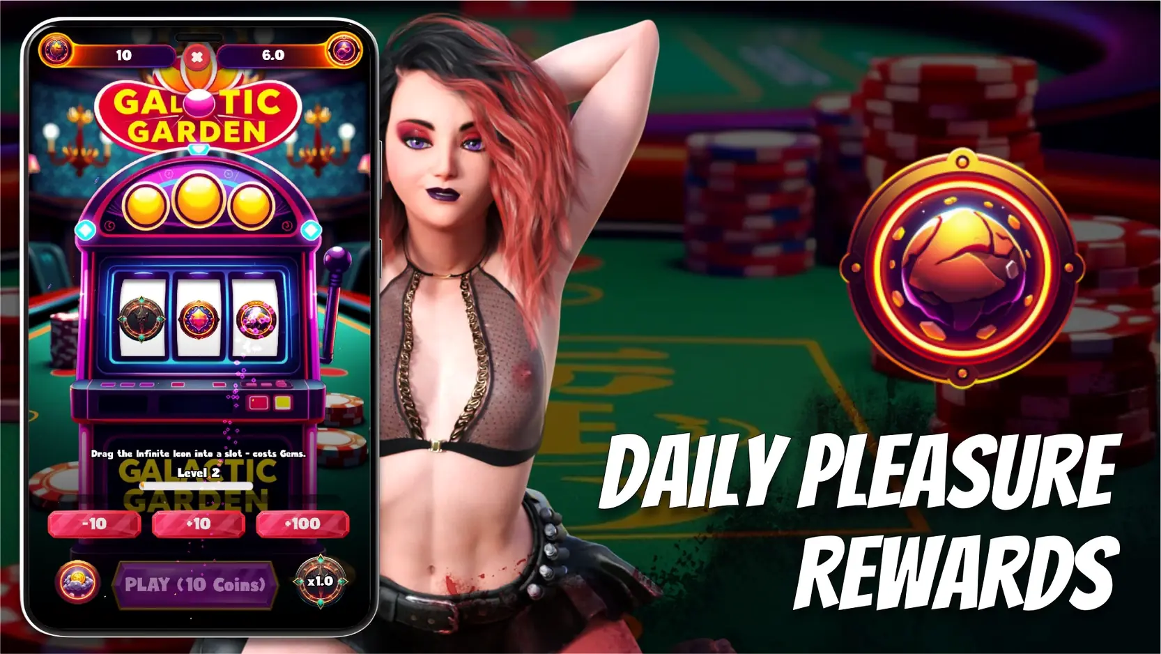 Climax Slots is an arousing, free-to-play NSFW slot game where fantasy meets pleasure. Explore seven seductive machines themed around erotic realms and taboo desires. Spin to earn Coins and Gems, unlock provocative artwork, and experience thrilling adult bonus rounds – all without real-money gambling.