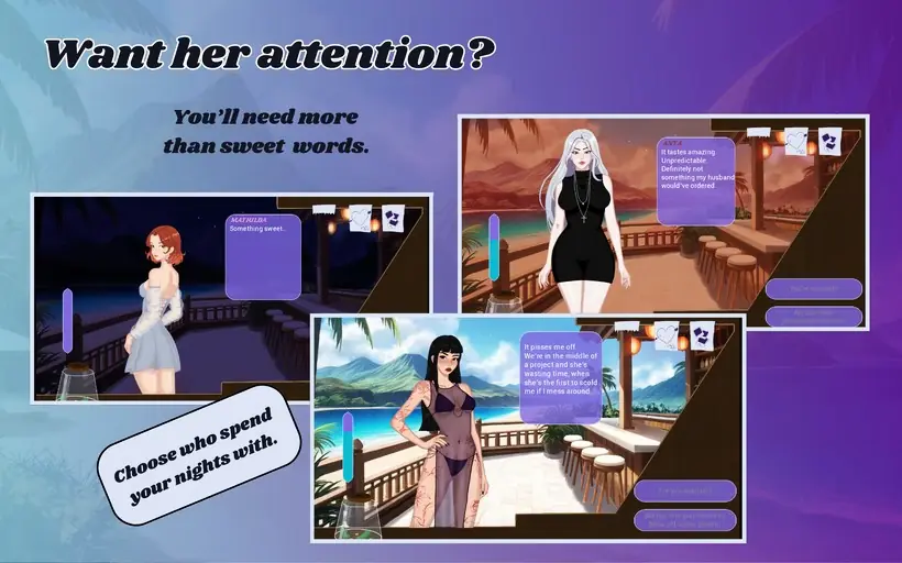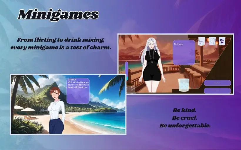 Coral Cove Club is a V/N dating sim where you play as the new, mysterious bartender at the Coral Cove Hotel bar.