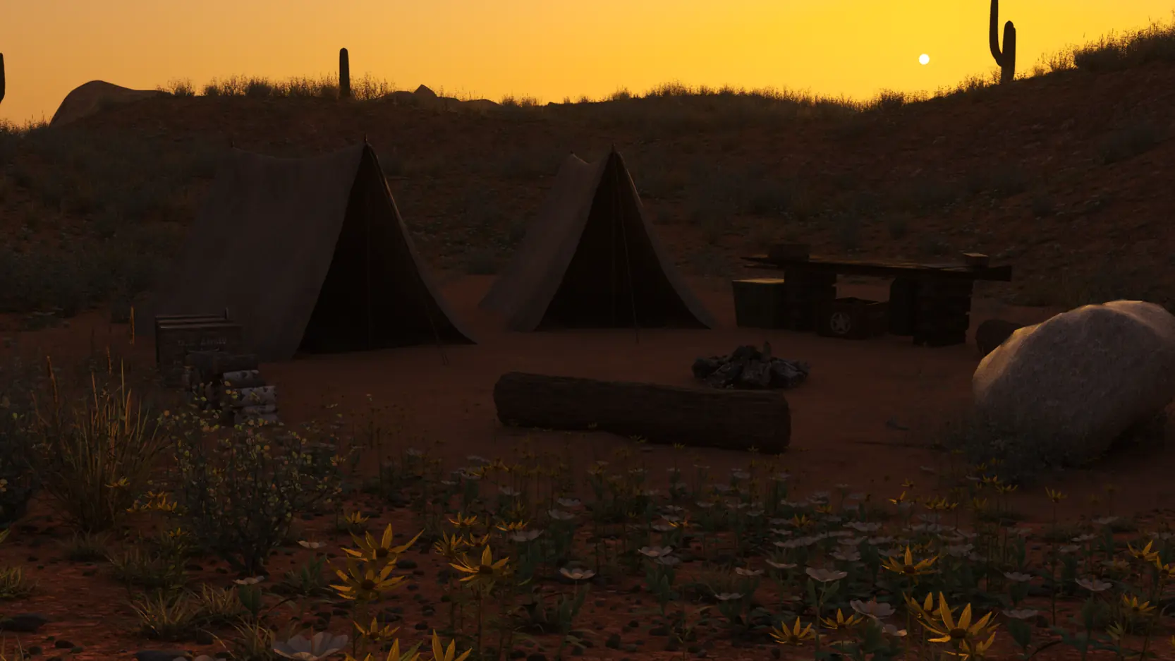 Story continues with the Evening scene for the third camp (spicy, experimenting with very simple animation)