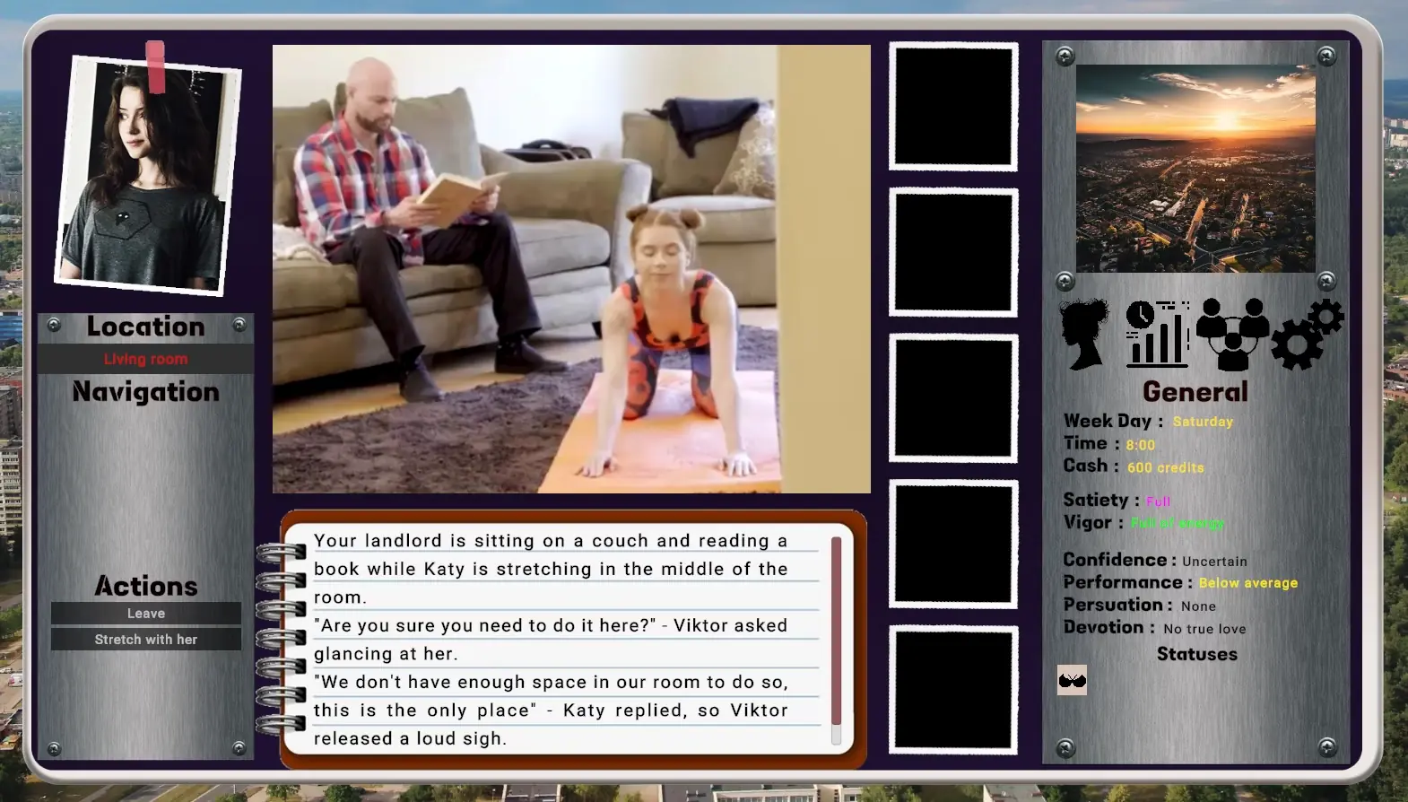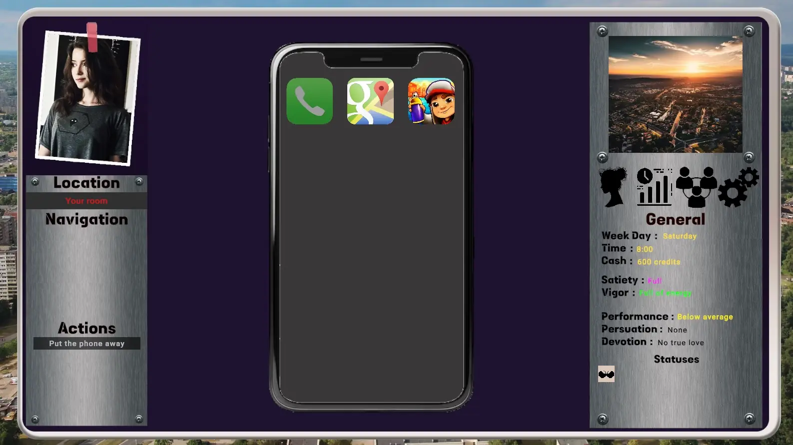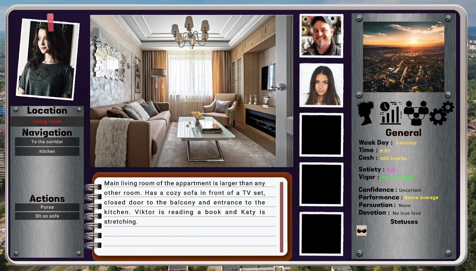 Devotion is a sandbox text-base game with illustrative content that try to roughly fit the character description, story narrative, locations and scenes. You are playing as young female living with her ‘landlord’ and ‘roommates’, you all suffered a horrible tragedy, but now it’s time to move on and fix what was broken. You are here to fix your relations with the closest people, graduate, choose the path in life and of course find a loved one.