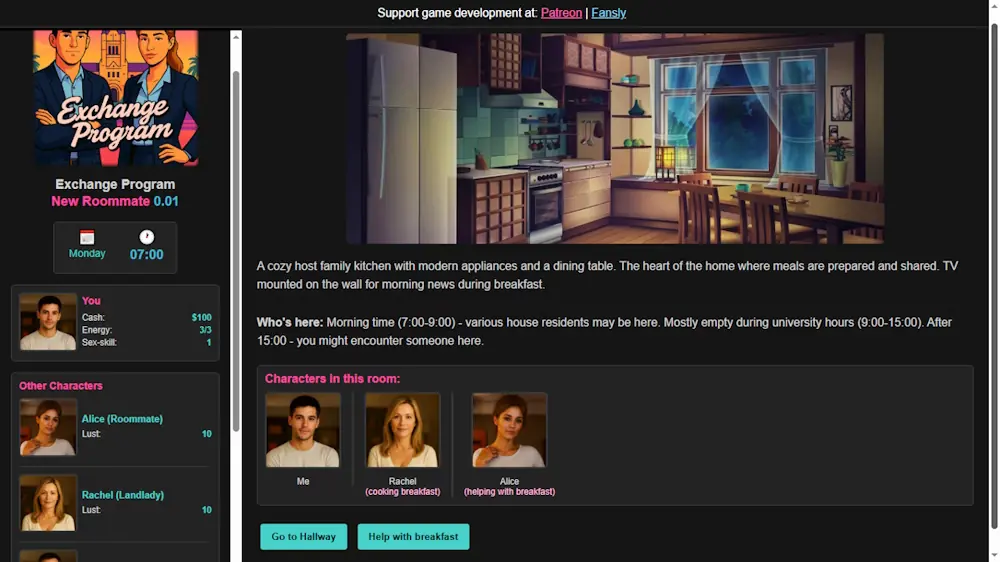 Exchange Program: New Roommate's latest build v.0.01 is available in Windows, MacOS, Linux platforms and currently Ongoing. We last updated this game in September 25, 2025.