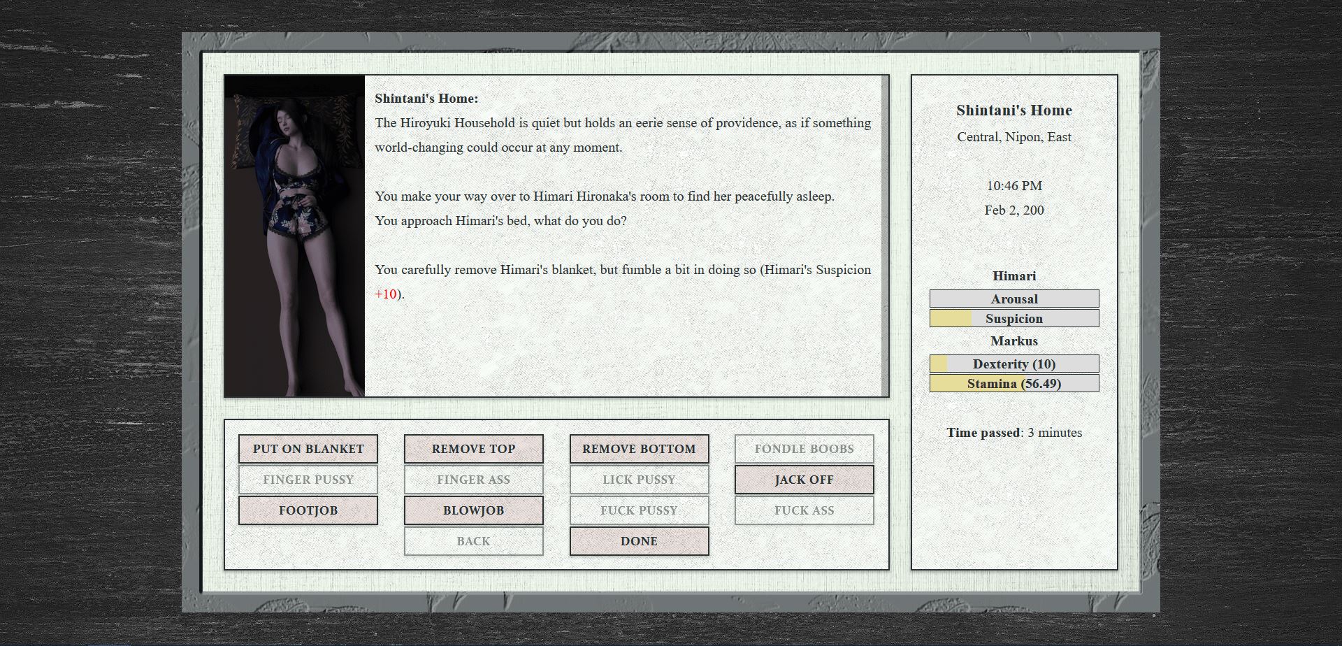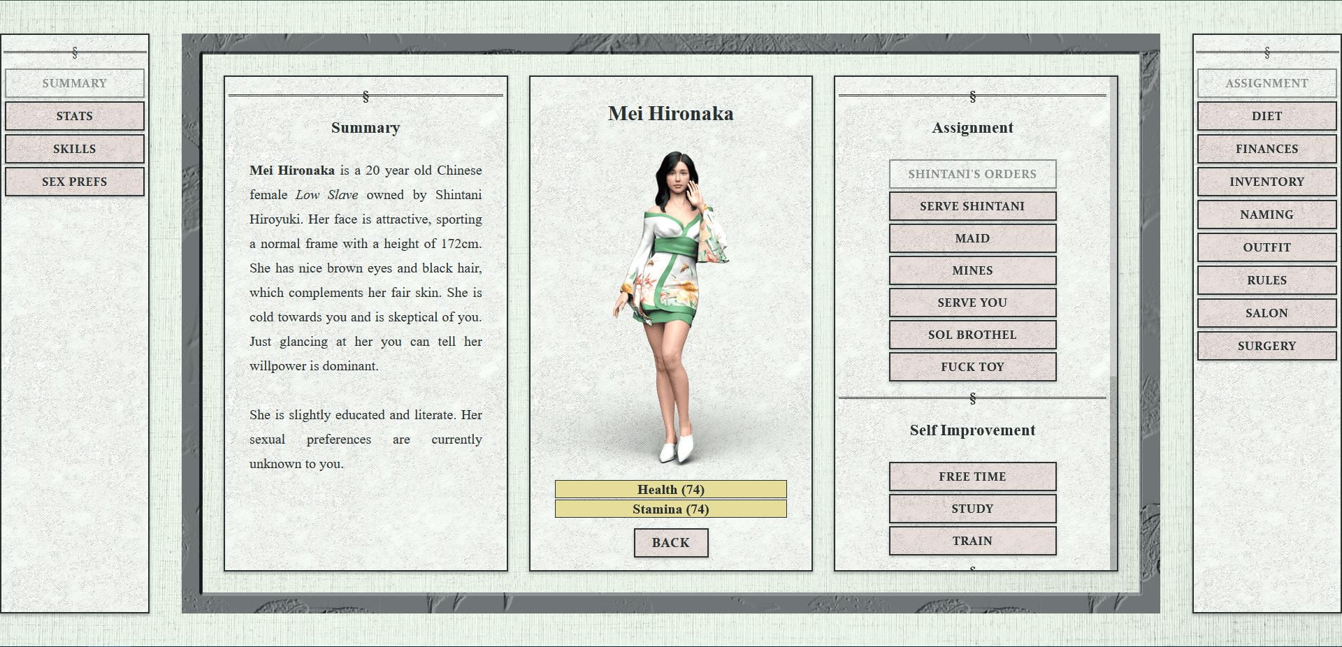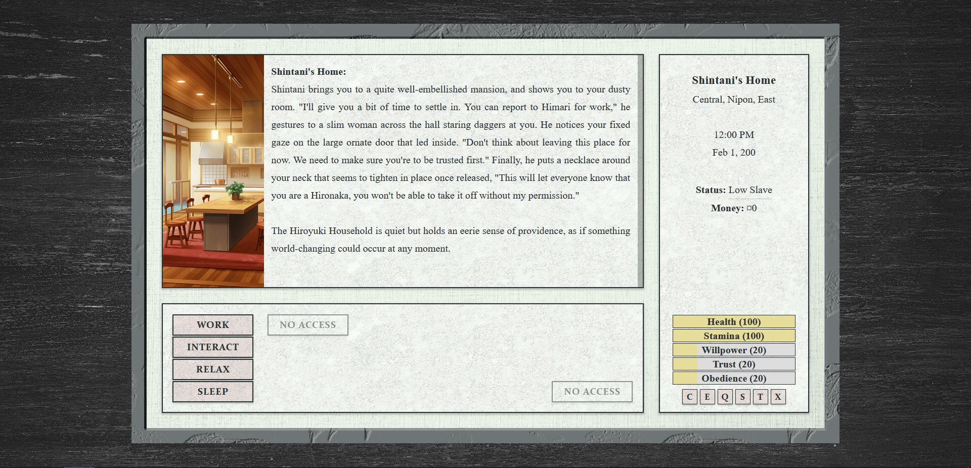 Free Cities: Origins (FCO) is an HTML game developed using SugarCube 2 based on the famous Free Cities HTML game by FCAuthor. While FreeCities was a management-centric game, we wanted to give an RPG spin on it. In FCO you are thrown into the world years after the fall of modern civilization. The Gregorian calendar while still in use, has reset its year sometime in the past. You start as an unfortunate soul who is enslaved by slave owner Shintani Hiroyuki, who, unbeknownst to him, is obsessed with his Japanese heritage and seeks to rebuild the civilizations from the myths of old.