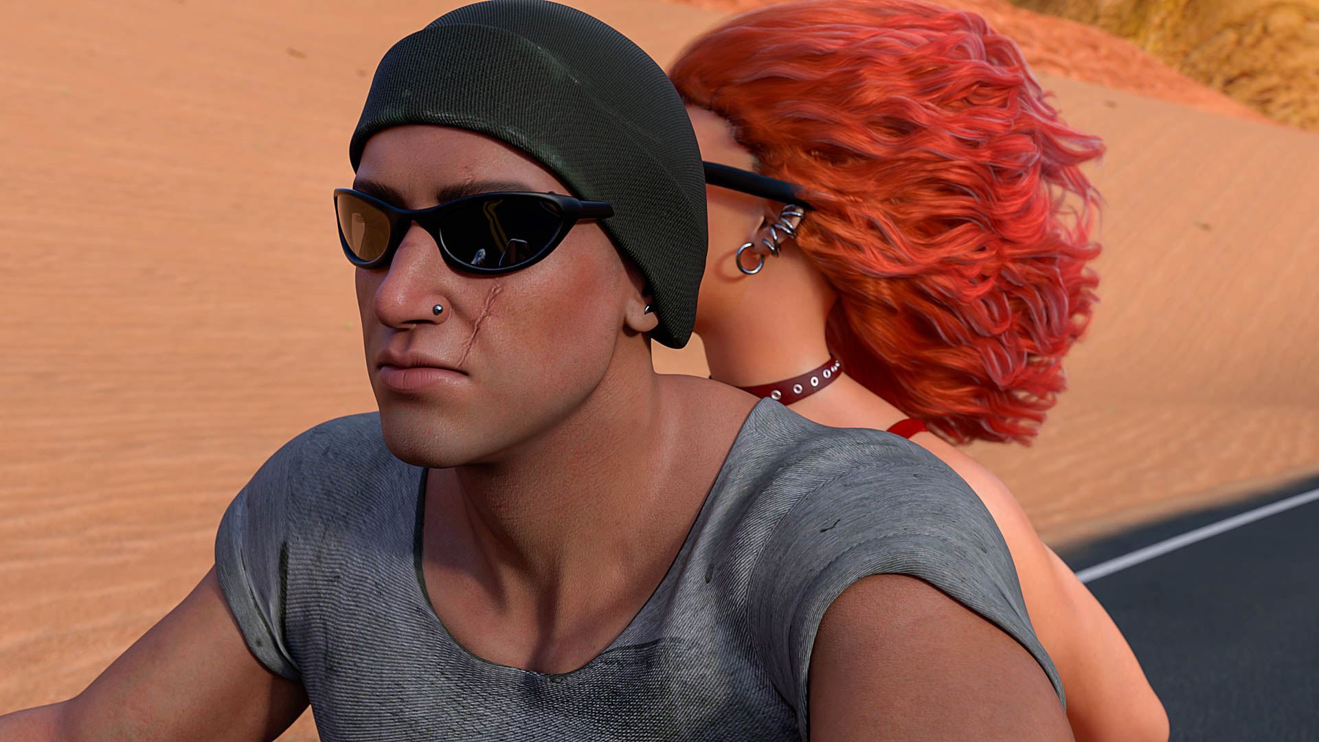What is that hot redhead doing racing thru the desert, all but naked, on the back of a motorcycle?