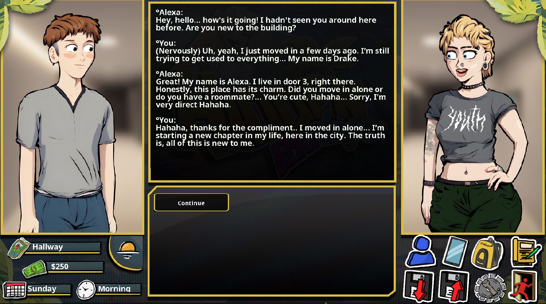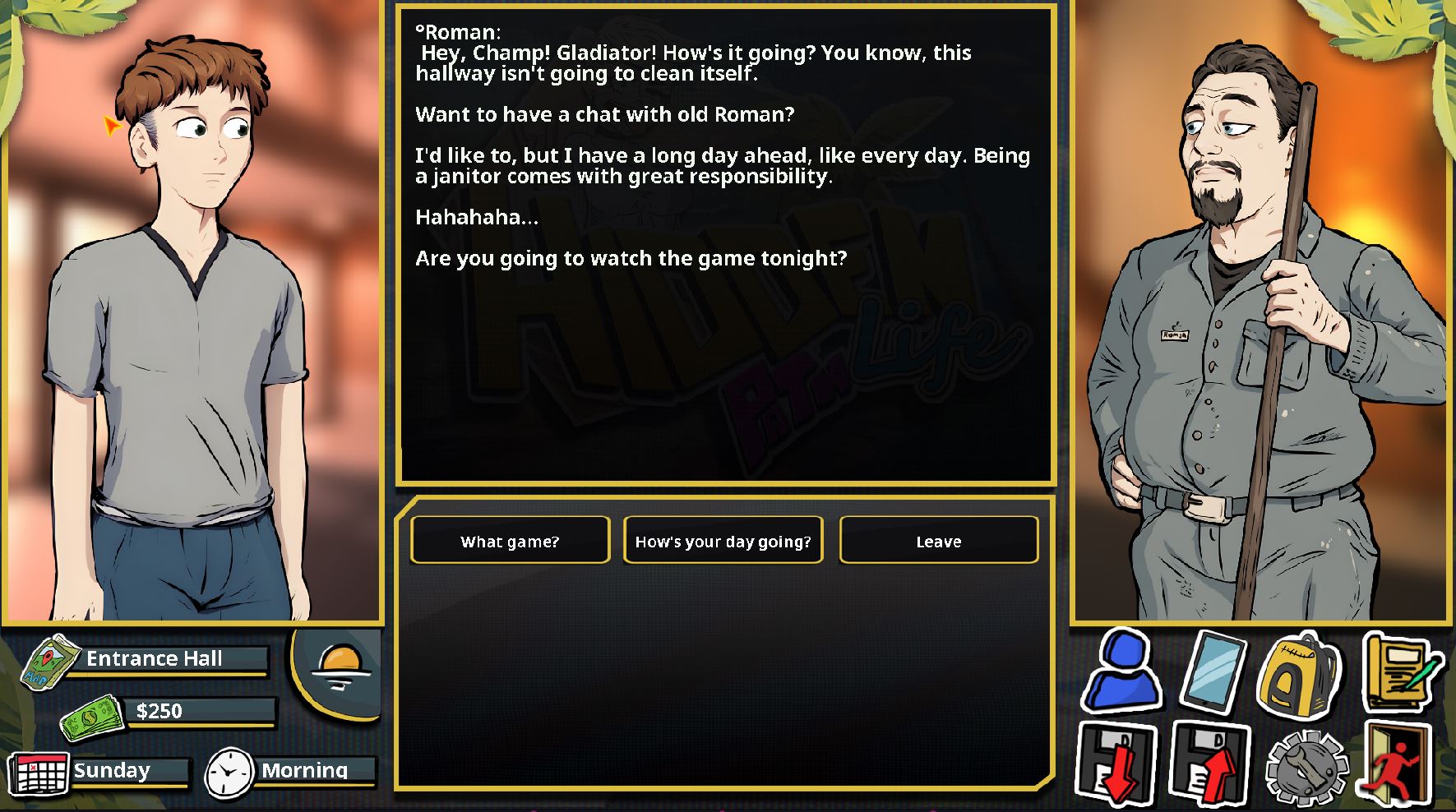 In Hidden Path Life, take on the role of a customizable young guy who moves to a new city called HighVille. Here, he will start a new chapter in his life, chasing his dreams and leaving his past behind. With little money in his pocket, he must find a way to make a living. Although his initial dream is to get involved in professional wrestling, the game offers a wide range of actions: from attending university and working to engaging in romances and love adventures.​