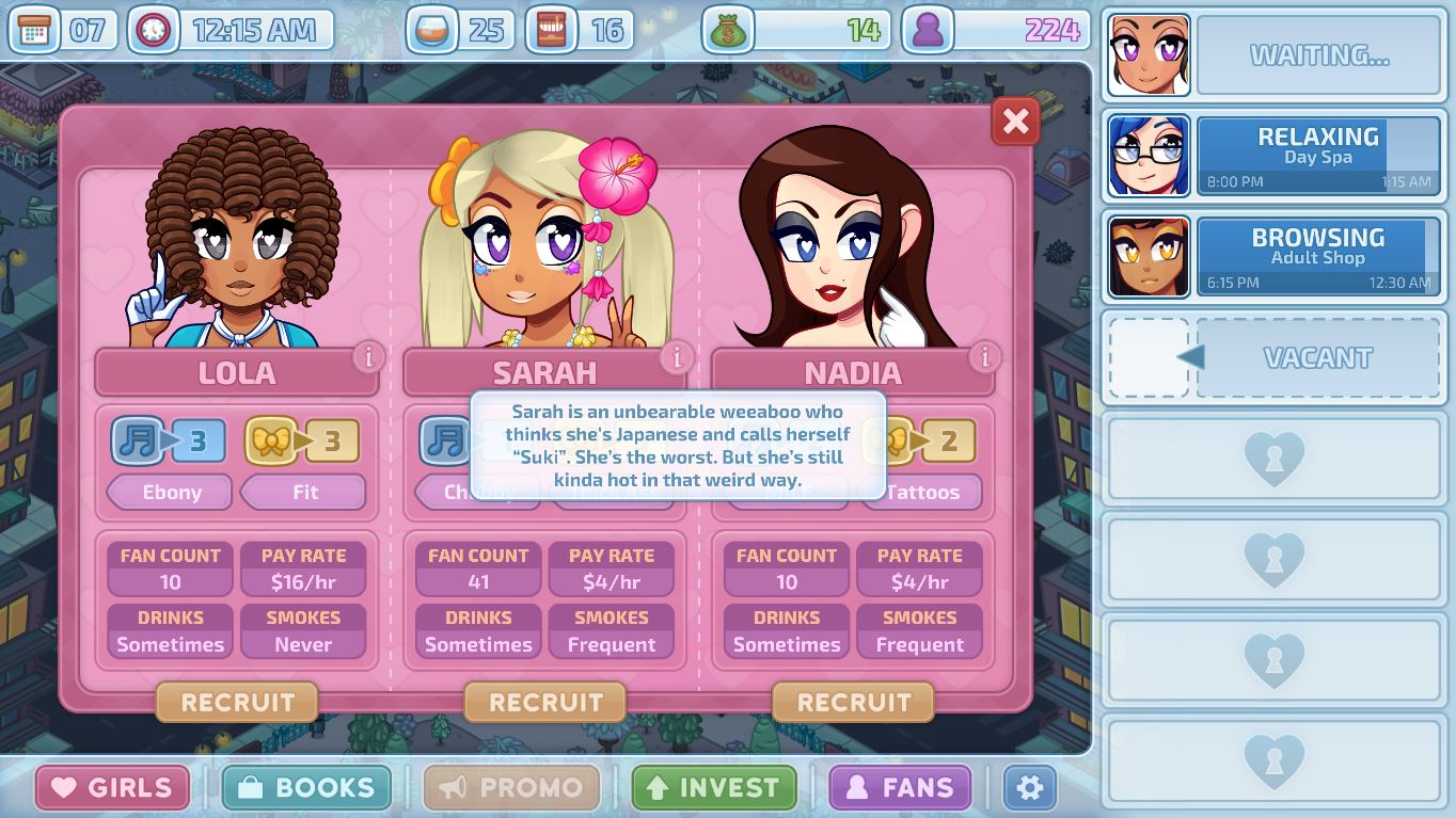 In HunieCam Studio players take control of a sleazy cam girl operation. Rake in stacks of filthy internet money and attract as many disgusting fans as you can in this fast paced, click happy and thoroughly perverted take on the business tycoon / management sim genre! Recruit cam models from an eclectic cast of cuties who have probably made some poor life choices. Manage your girls’ daily errands/activities to keep them stress-free and productive. Invest in various aspects of your business to improve functions and expand operations. Optimize your cam shows by promoting girls who match popular trends/fetishes. Abandon your morals and disappoint everybody who cares about you!