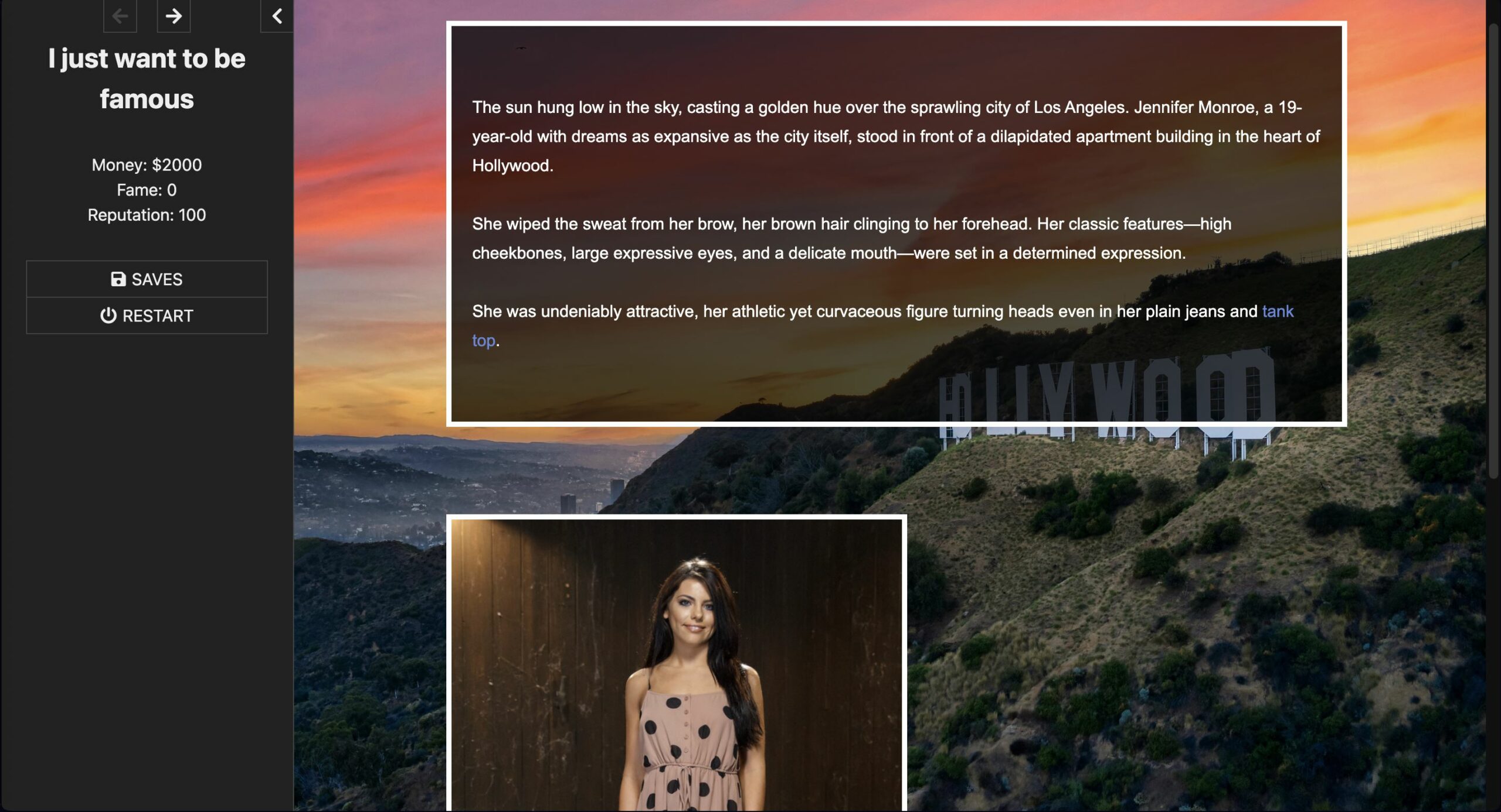 Follow Jennifer on her way to Hollywood Fame. Make choices and tackle obstacles along the way to the top of the chain. Would she end up as the starlet she desires or end up with a career that ruins her innocence?