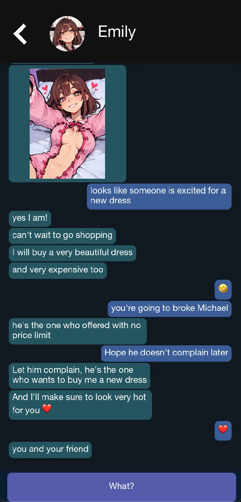 It tells the story of your girlfriend Emily and what happens when you lend her to one of your friends for the night.