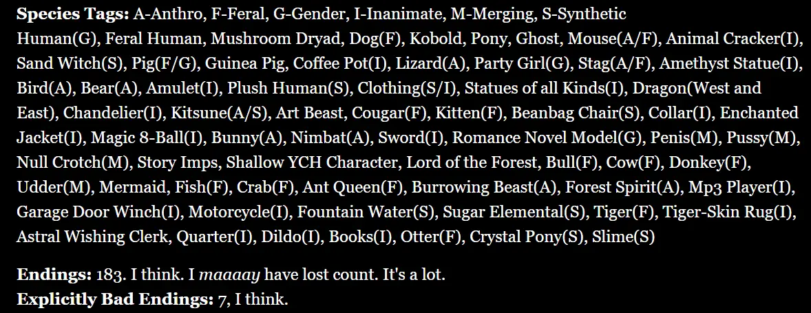 This is, of course, a test of character, laden with TF boobytraps. With over 180 endings and a staggering amount of transformations, there’s something for everyone to enjoy. Come in! Get changed. The mistress will see you soon.​