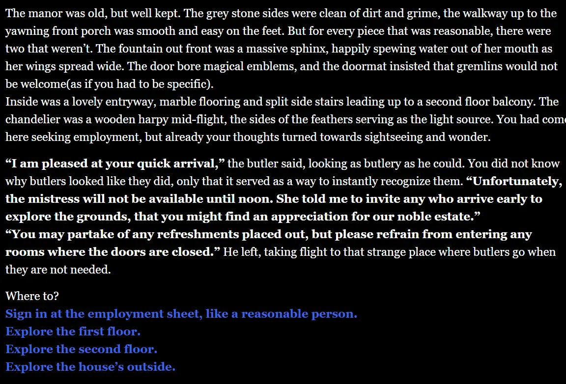 But it seems you’ve arrived early. That’s quite alright. The mistress left instructions, that anyone arriving early should take time to explore the manor grounds and see the place they want to work at, to gain an appreciation for the estate.