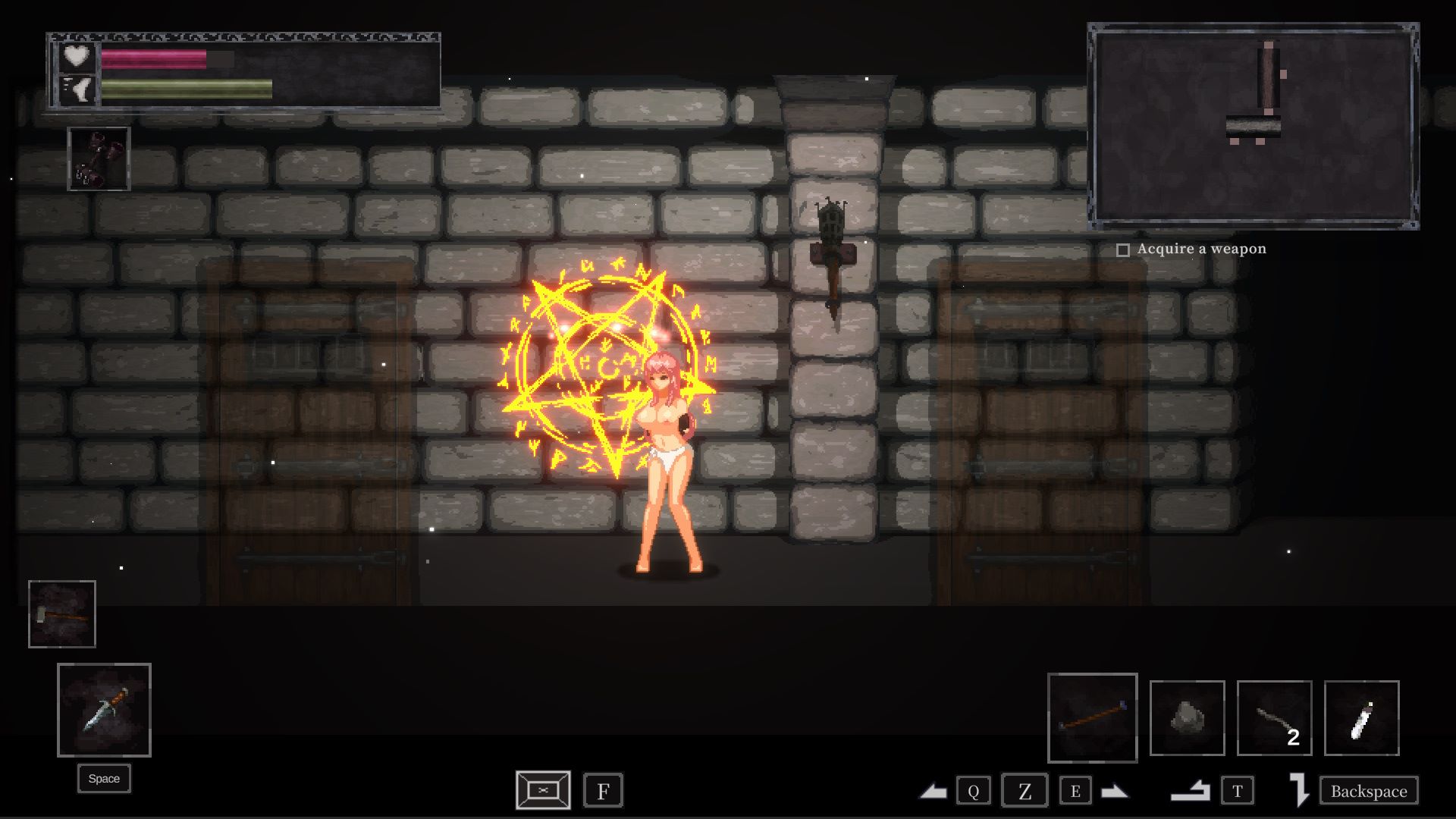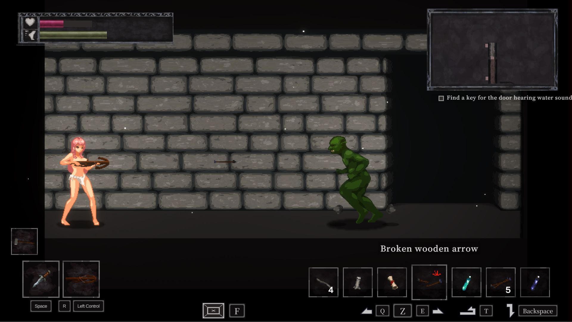 Sidescrolling RoR stealth game that appears to be heavily inspired by Unholy Jail. Very much like that game, you have to navigate the dungeon while avoiding being discovered by enemies. The game ends if your health bar runs out or if you’re capture while on low health. While exploring the dungeon you’ll find useful items that will help you in your escape (potions, keys, food, etc.). A lot of emphasis is put on sound; running or using certain items will create noise that will alert nearby enemies and you can understand that an enemy is nearby by hearing their footsteps.