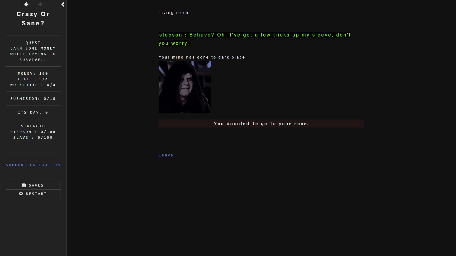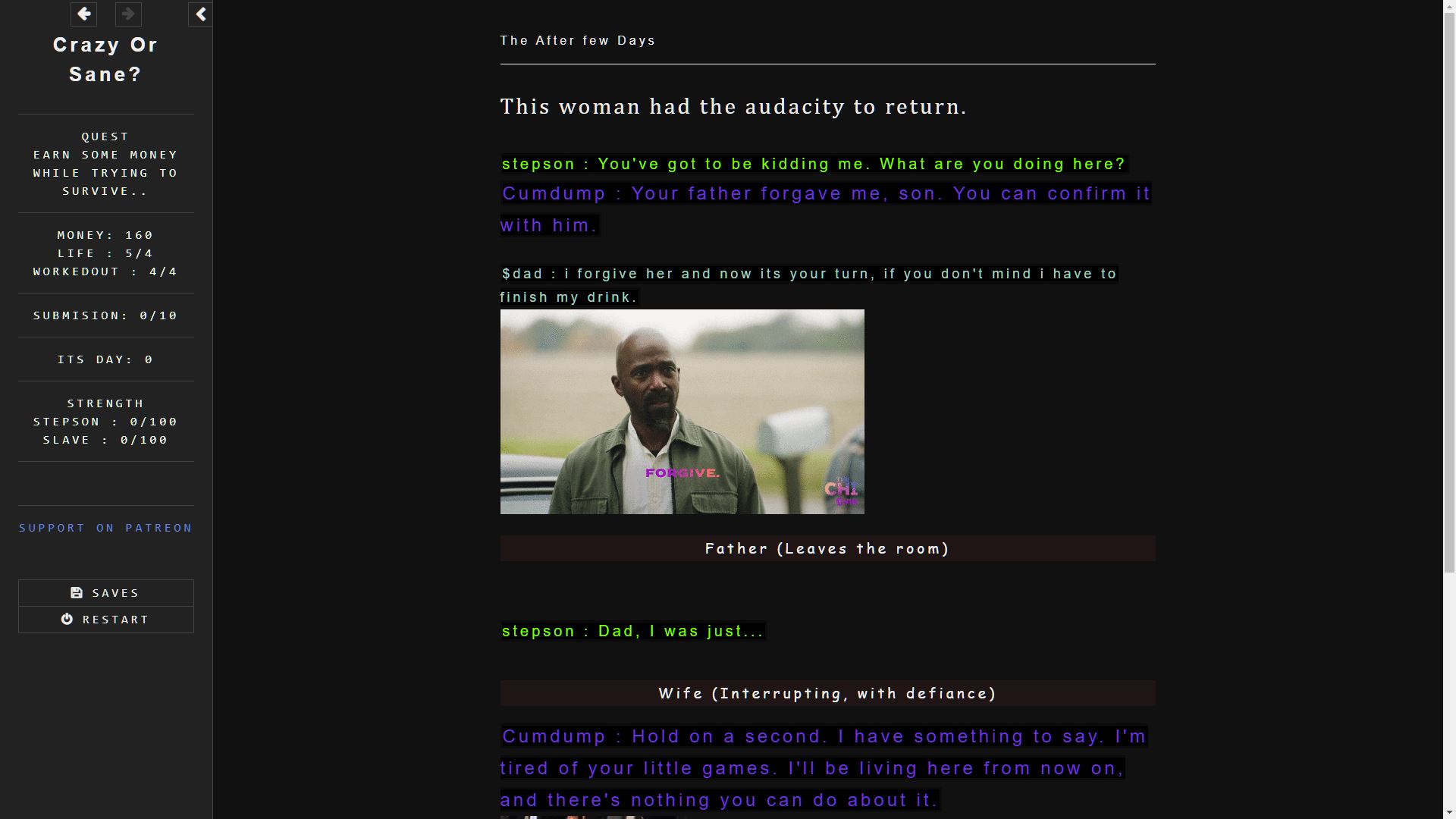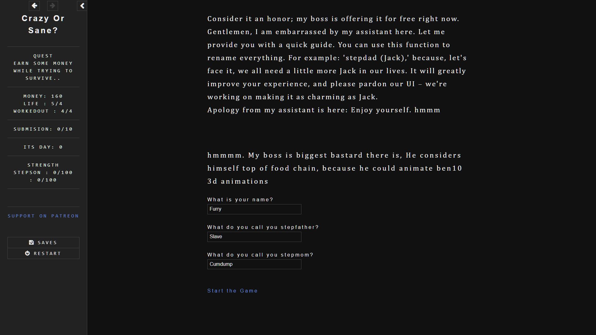 i made game easy just as people wanted and also there were less words take a look now, about the story brother have patience, everything i do have meaning. Update will end submision level 2 but it has many scenes in it. 1.add more scenes and better start, more scenes 2.worked on readibility 3.worked on story now it won't fill empty like last time yeah sorry about that. 5.pleasing scenes and gameplay now it has became easy- yes sorry about last time html game will have little difficulty also i will keep it modrate in future. 6.added scenes in submision level 1 and 2. 7.better start yeah am talking about intro. 8.i gave detailed discription in intro on how game works 9. i also added and refined relation and character naming and please forgive me new scenes and some old one will not have refined to perfection because i could not maintain my sanity after getting 25+ boner within 5 hours. 10. removed annoyong timed event even tho it took me so much to make them fak- there still one or two in game so use save often. 11. there are multiple scenes added on each level also some that can be found here and there trying combination like sending him away-each submision level has diffrent scenes. 12. more event and text,words, you can still die multiple ways.... 13. not everything can be done in small ammount of time so look forward to future update it will be more twisted be prepaired. 14. rage meter is for future scene- twisted one also it has no scenes right now.