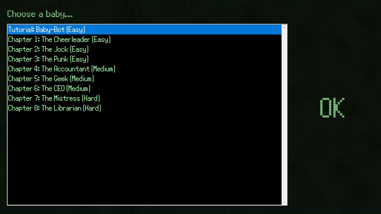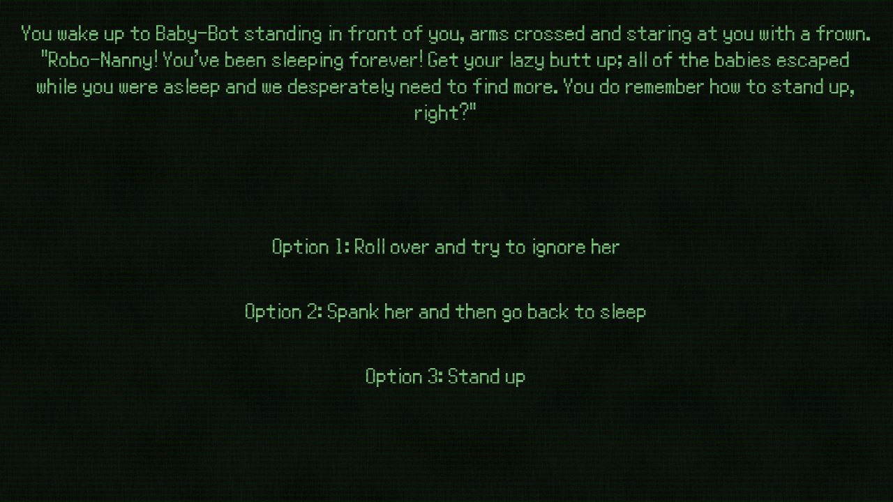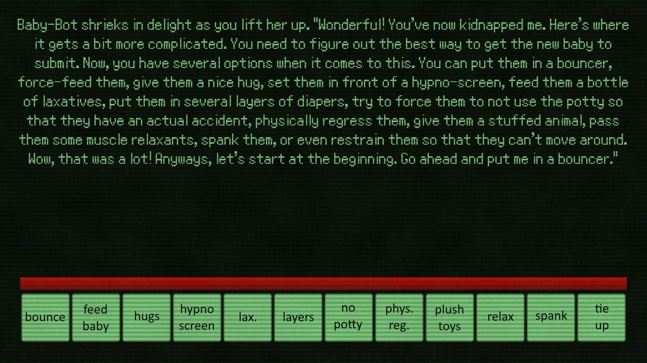 Play as your friendly neighborhood robotic nanny, luring people in and capturing them to put them in her mechanical nursery. Figure out how to capture them and bring them home in the Capture portion, then get them to submit to being your pampered little baby forever in the Domination portion. Expect diapers, babying, embarrassment, and some light BDSM elements.