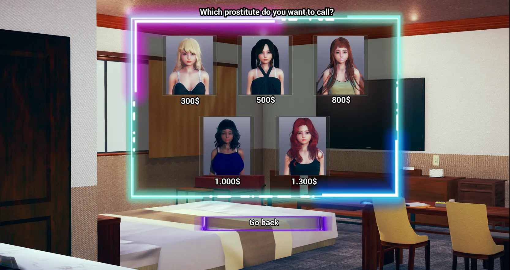 You can return to the hotel whenever you want and hire the services of the best prostitutes in town. You can choose between 5 of them, each one more expensive. You can choose between 4 different poses with each prostitute to satisfy your needs. There are a total of 20 different sexual scenes.