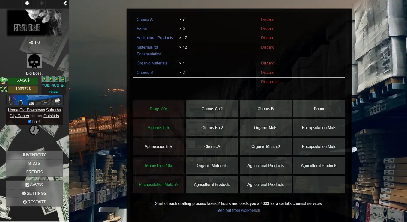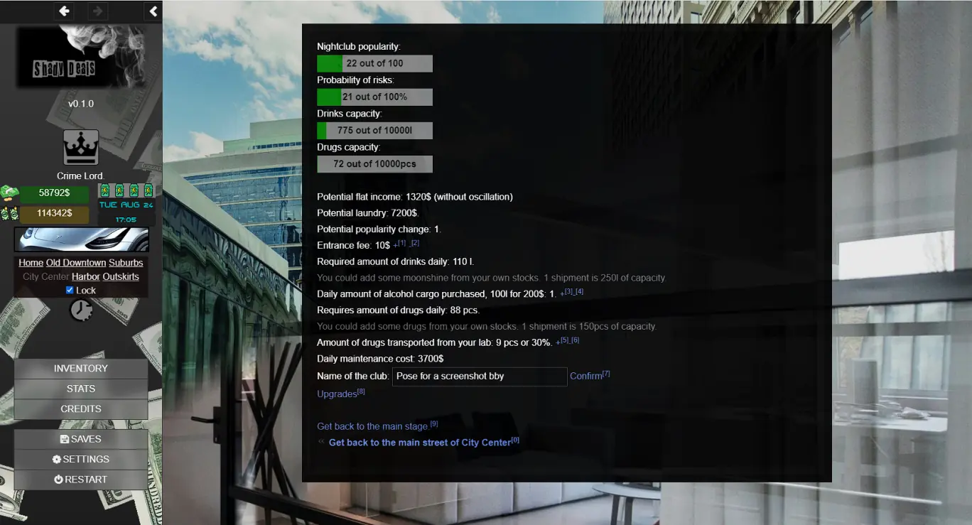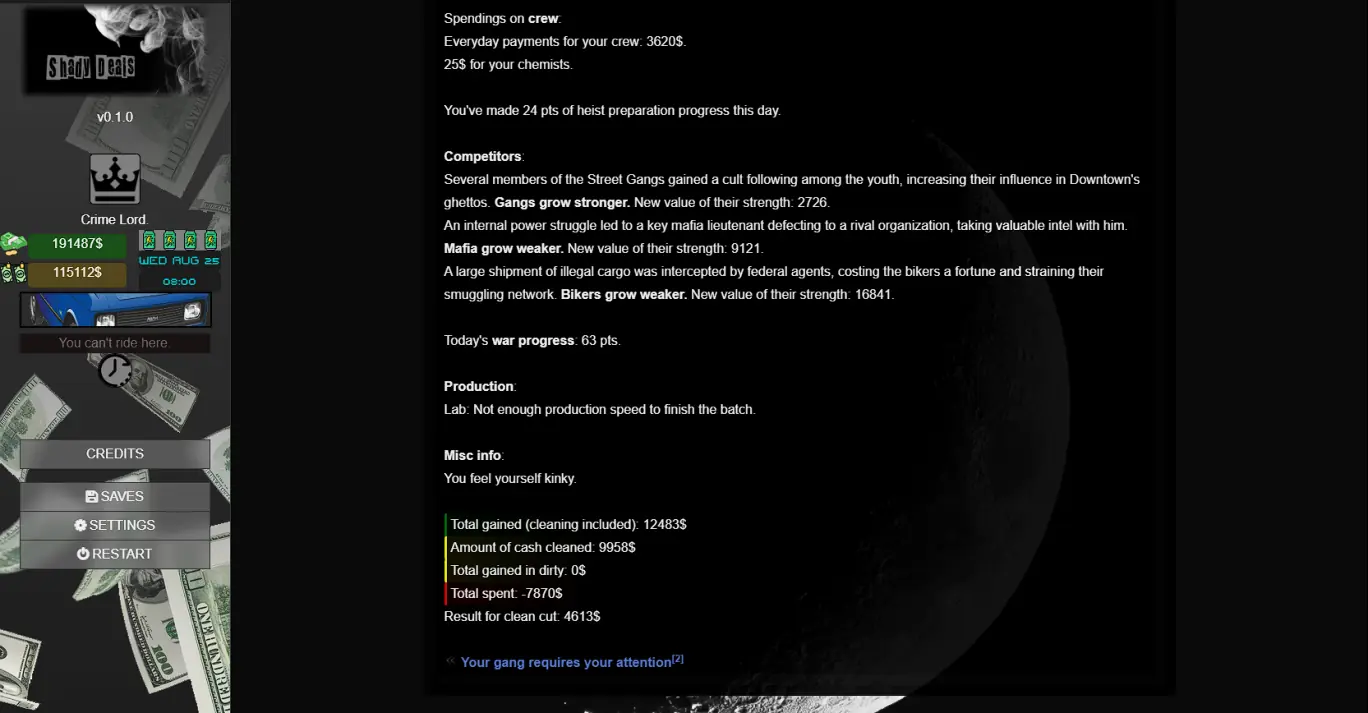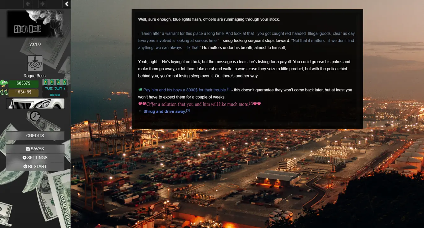 An interactive fiction with RPG and management elements where you build your own criminal empire. You take on the role of a girl raised in a crime dynasty, sent on a mission to establish her own organization in a city flooded with gangs. Choose your bio – and go, commit some crimes. You start as a no-name hustler who just moved into the city, and you gotta make a name for yourself. Steal cars, rob houses, pick pockets, distribute and cook various substances ghetto-style or get yourself a nice cozy lab, and a lot more. And soon enough, you’re gonna conquer all the turfs and set up a bunch of shady enterprises.