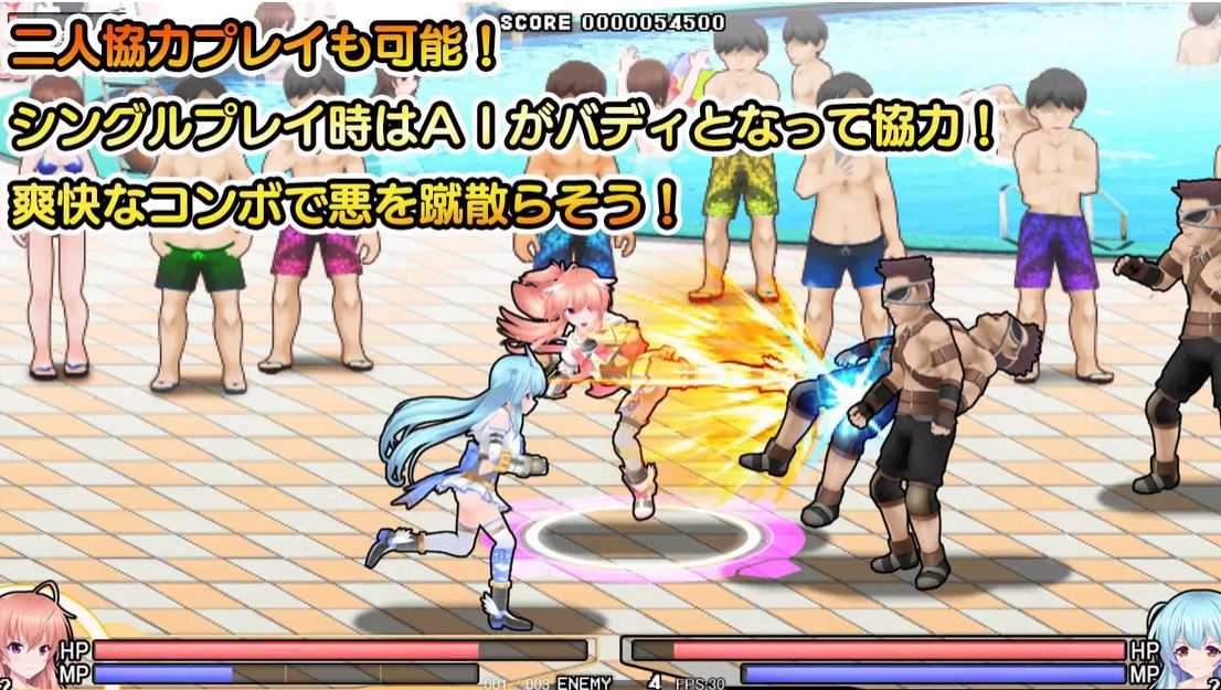 A side-scrolling action game with with smooth, beautiful combos, two lovely transforming heroines, and plentiful H!