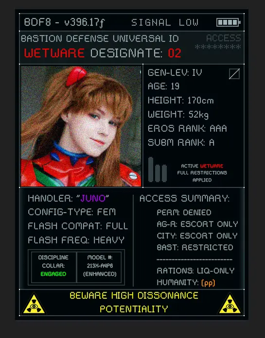 Mind-flashed and locked into their Wetsuits, the submissive few capable of piloting an Instrument are humanity’s last defense against a Dissonant song that has washed over the world. Settle into your restraints, slot in, and try not to desync– the defense of the city is your duty, and failure demands punishment… or worse.