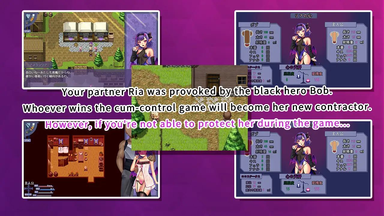 You’re a hero who has made a contract with a cute succubus named Ria. You give her your cum, and she gives you her power. However, even as a “spirited” hero. you seem unable to handle her milking skills. At the same time, a hero named Bob also appears, ready to form a contract with your precious Ria. This awkward triangle can only be solved with a match! A match to see who can last through 5 days of hardcore edging. The winner of the match gets the right to make a contract with Ria! The loser… well, a cruel fate awaits them…