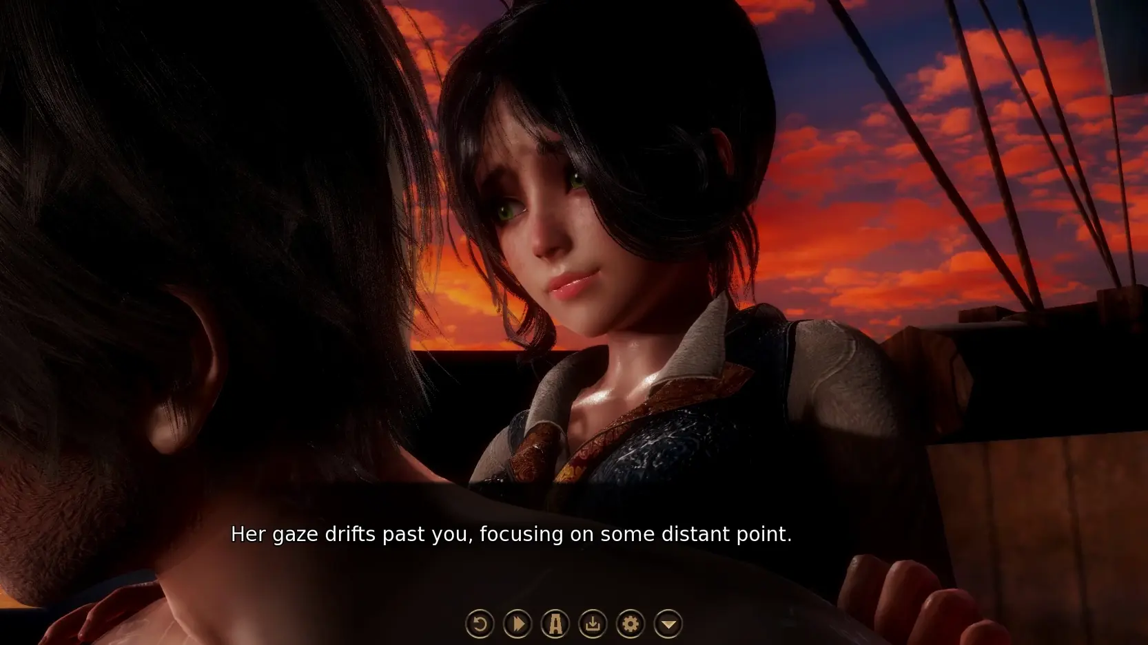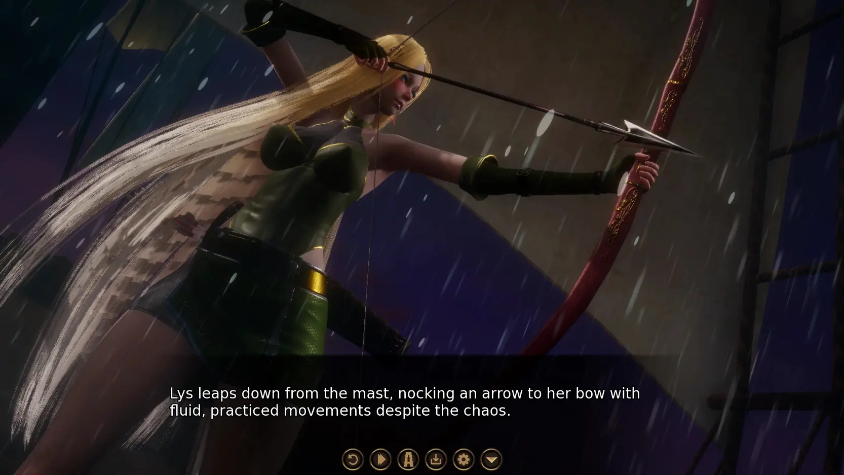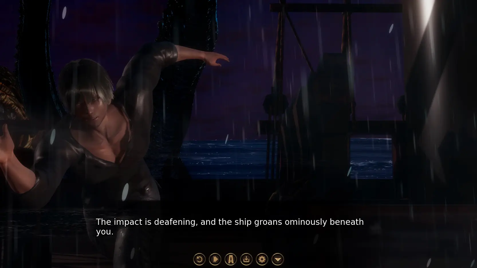 You wake with a start as the ship rocks violently, your hammock swinging hard and slamming against the bulkhead. A deep, resonant boom reverberates through the hull, shaking the timbers. You hear shouts and running footsteps above. You yank on your shirt and shove your feet into your boots before scrambling topside. Chaos greets you. The Captain stands at the helm, her muscular arms gripping the wheel. A massive shape looms above, blotting out the morning light with its enormous shadow. A kraken.