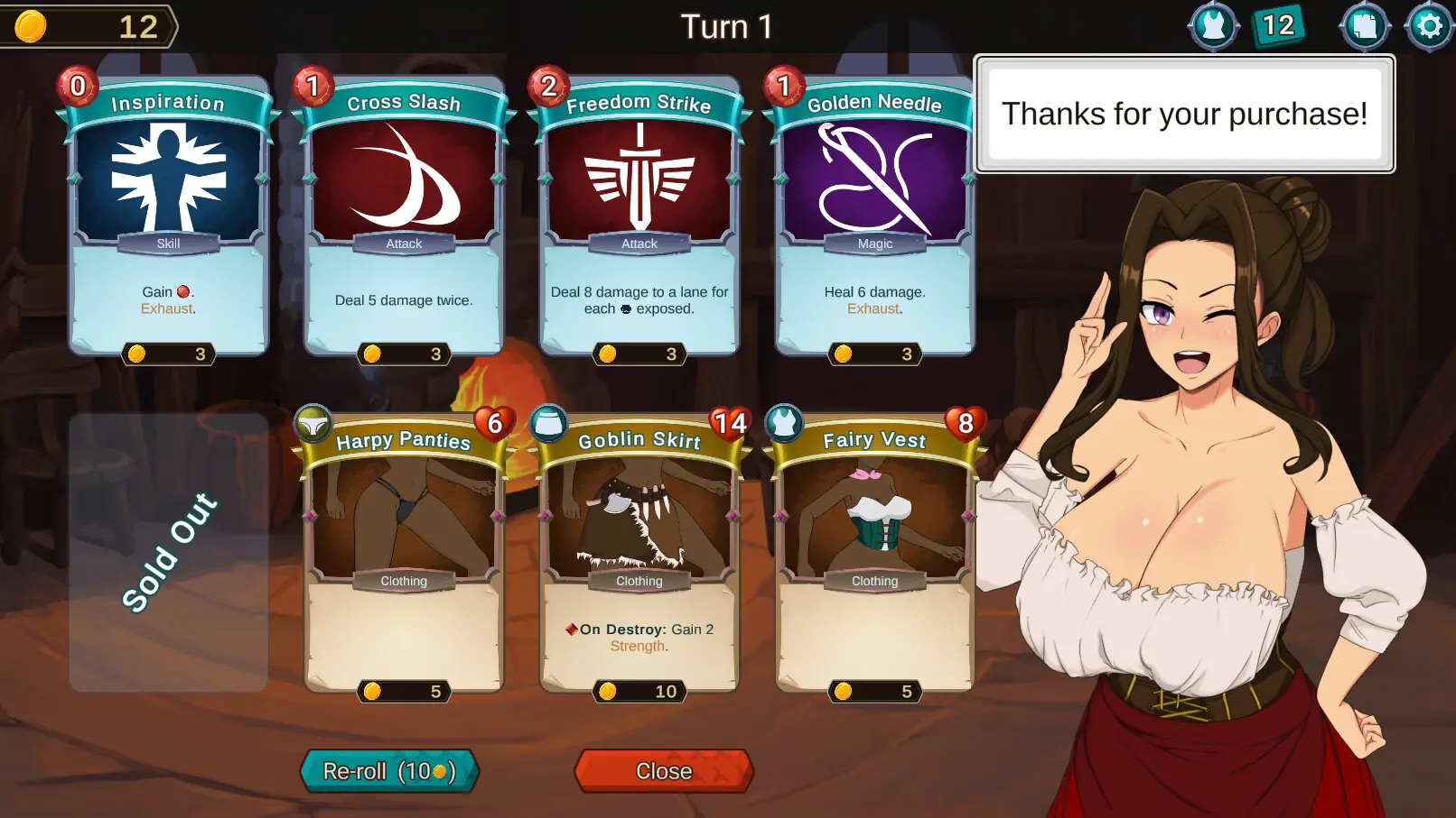 Get ready to bare it all and strip down opponents in exciting battles in this Roguelike Deckbuilding adventure, with 4 playable characters, lots of strategy and sexy action!