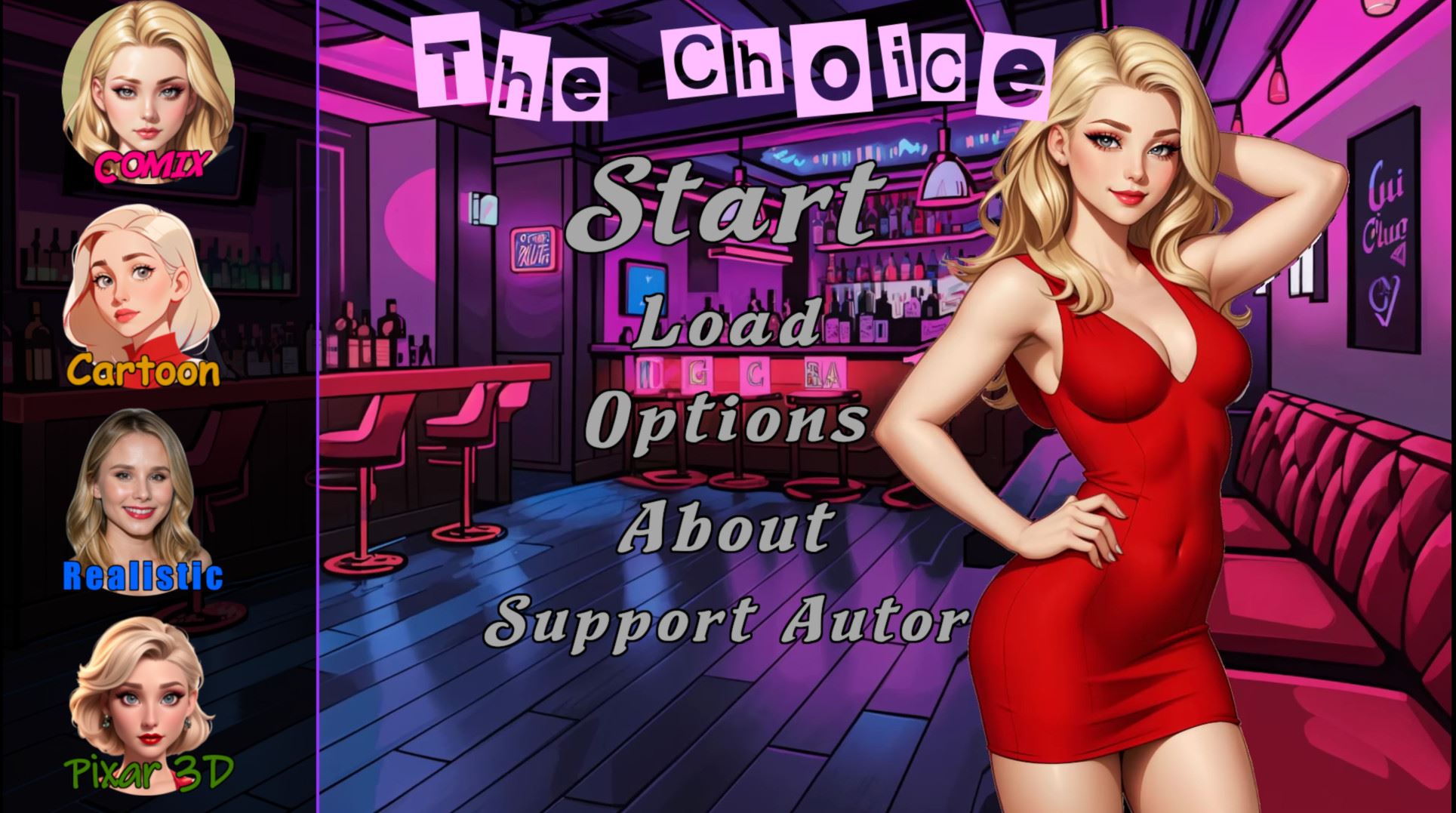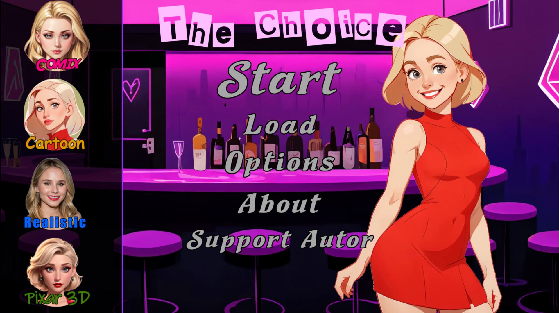 “The Choice” is a short visual novel, telling the story of a young and rich womanizer picks up a bored beauty in a bar. Whether this meeting will be pleasant for her or will turn out to be a sexual nightmare is up to you, the Player. After all, in the game any choice can be made repeatedly to see all possible variants. In this game you can choice style of CG you prefer on the fly – be it Realistic, Cartoonish, Western Comix or Pseudo 3D​