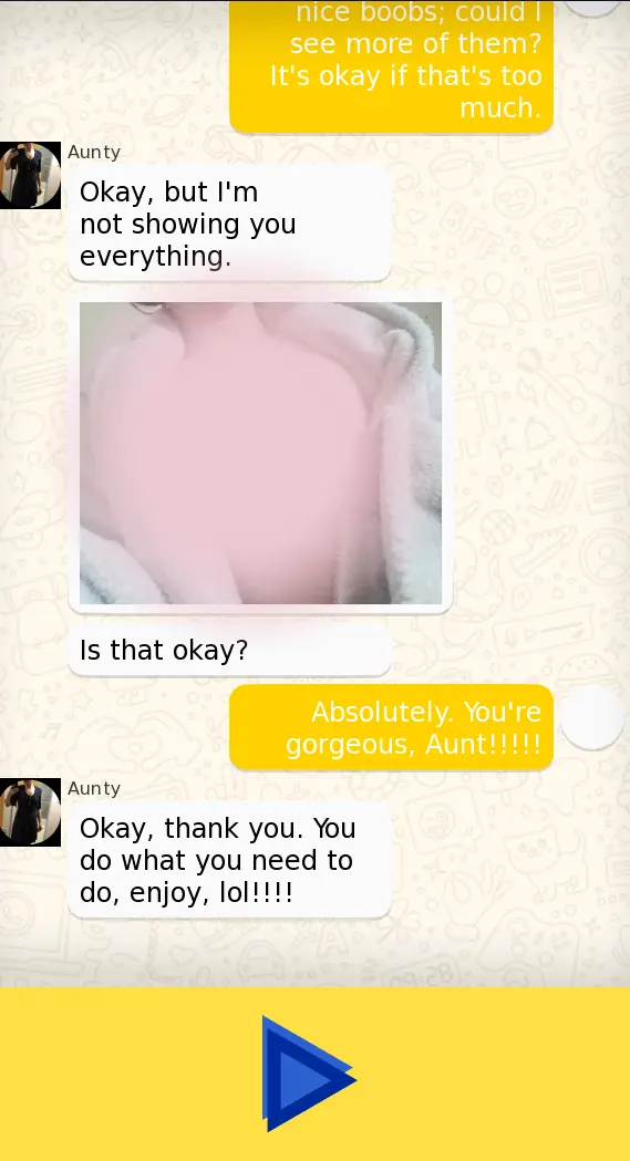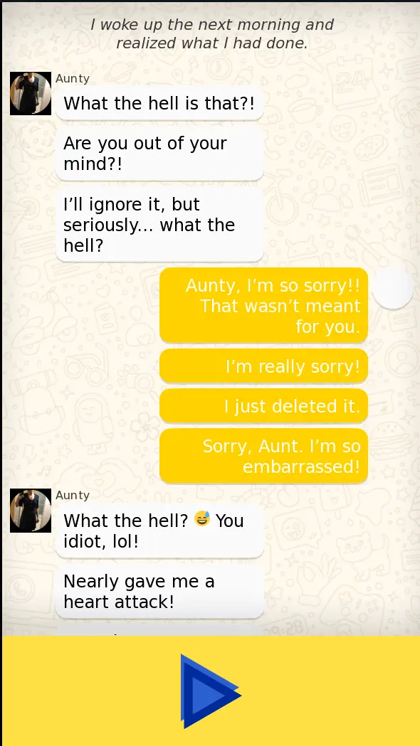 Based on a true story, this visual novel follows a shy 19-year-old guy who makes a big mistake. One night, while drunk, he accidentally sends a dick pic to his favorite aunt instead of his girlfriend. This mistake changes their relationship forever, turning it from innocent to something much more complicated.