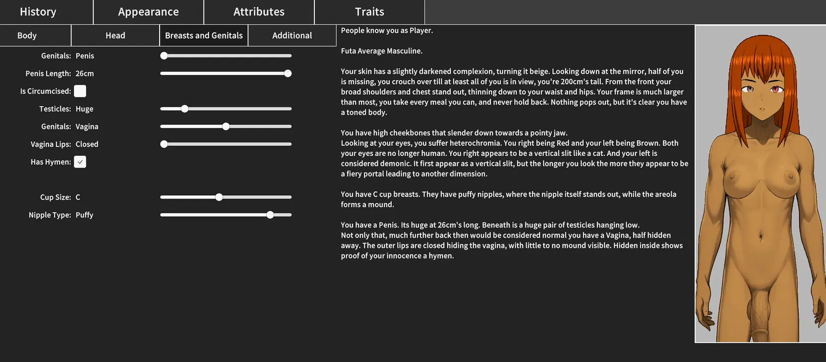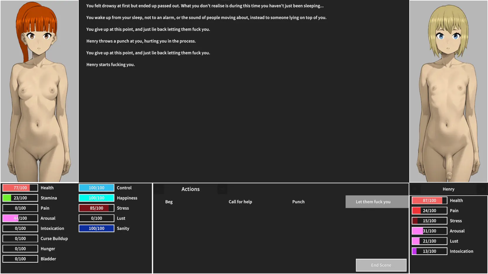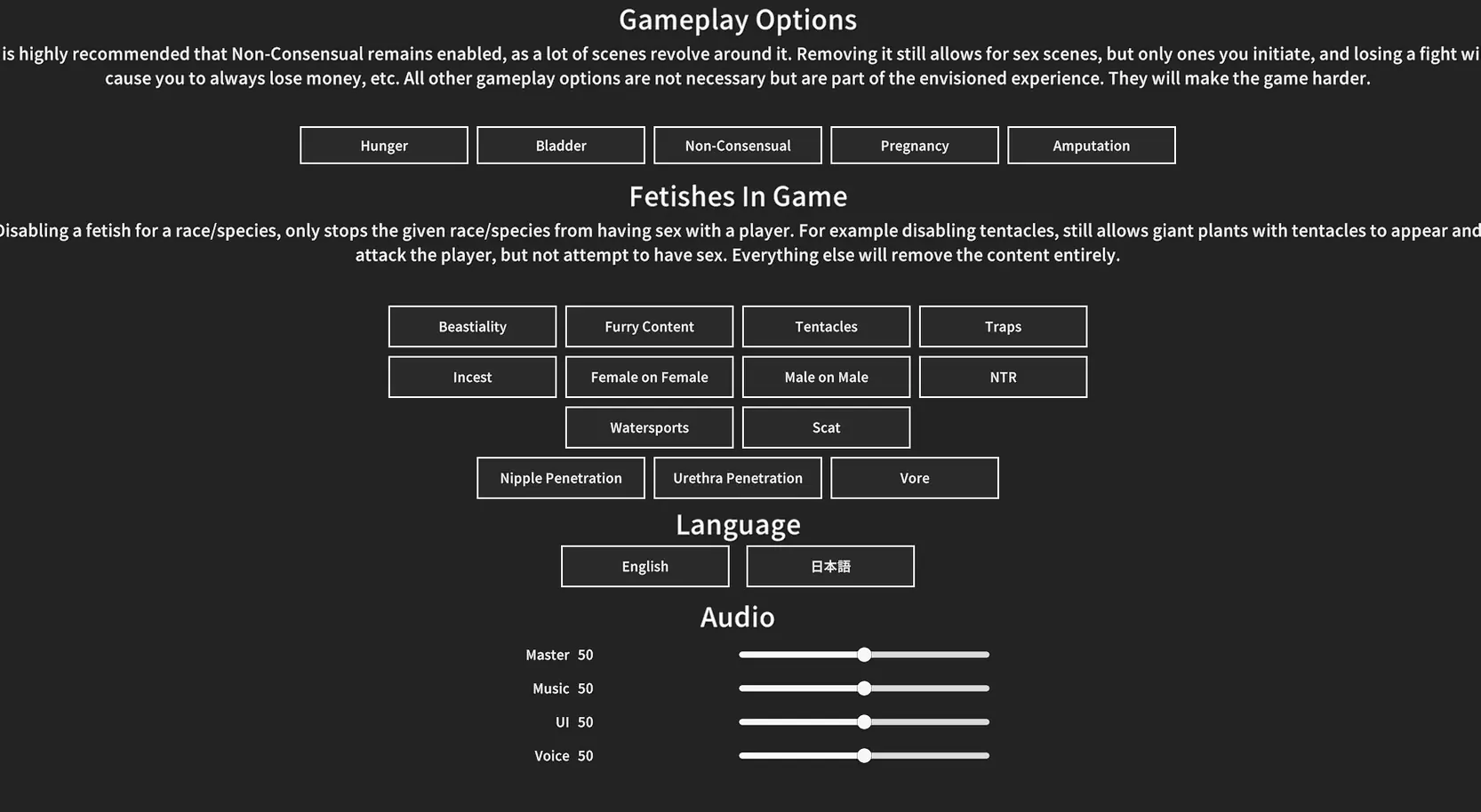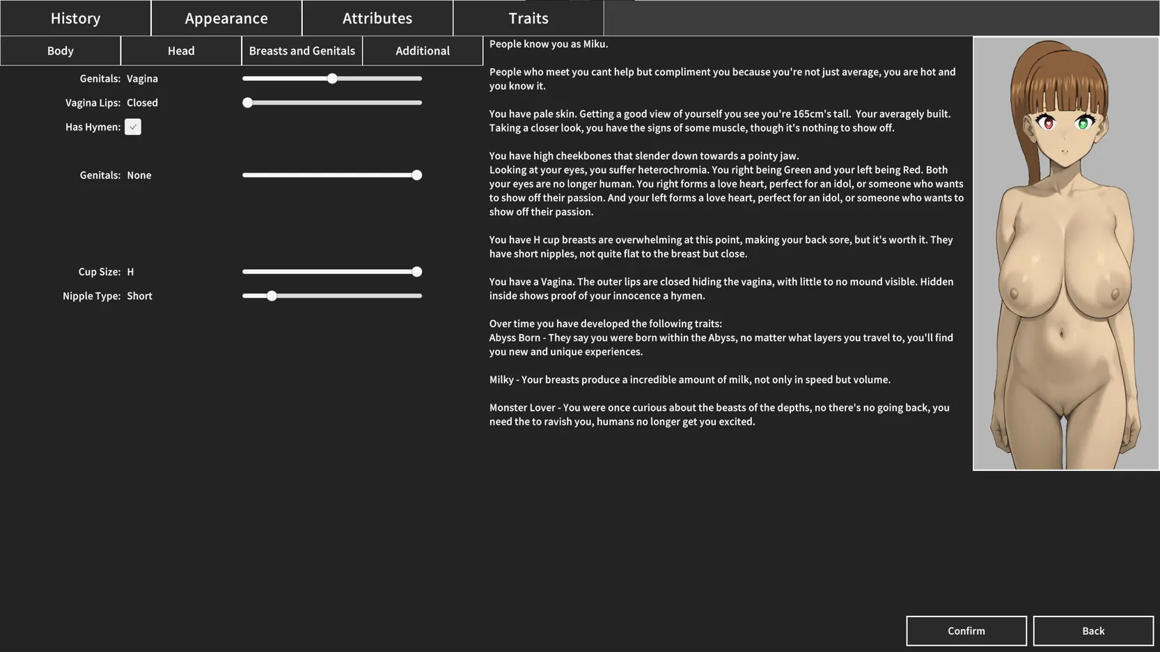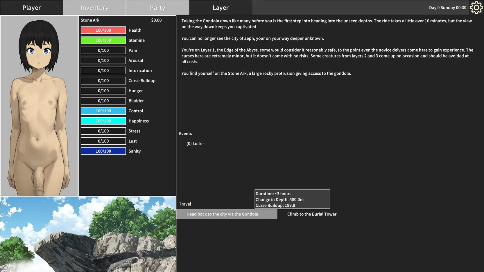 Taking heavy inspiration from Made in Abyss and Degrees of Lewdity, this is an RPG where you dive deeper into the world. With each layer you pass, enemies become more threating, the environment becomes harsher and the curses found become more extreme. All of which can become sexual in nature.Current features-Character creator.-A starting city, and layer 1 to explore.-Relics to find.-Basic levelling up system.-Several fighting scenes.-Curses that develop the appearance of your character.-Ability to work at jobs for money though can have unexpected outcomes.-Sexual events when passing out outside, or losing fights.