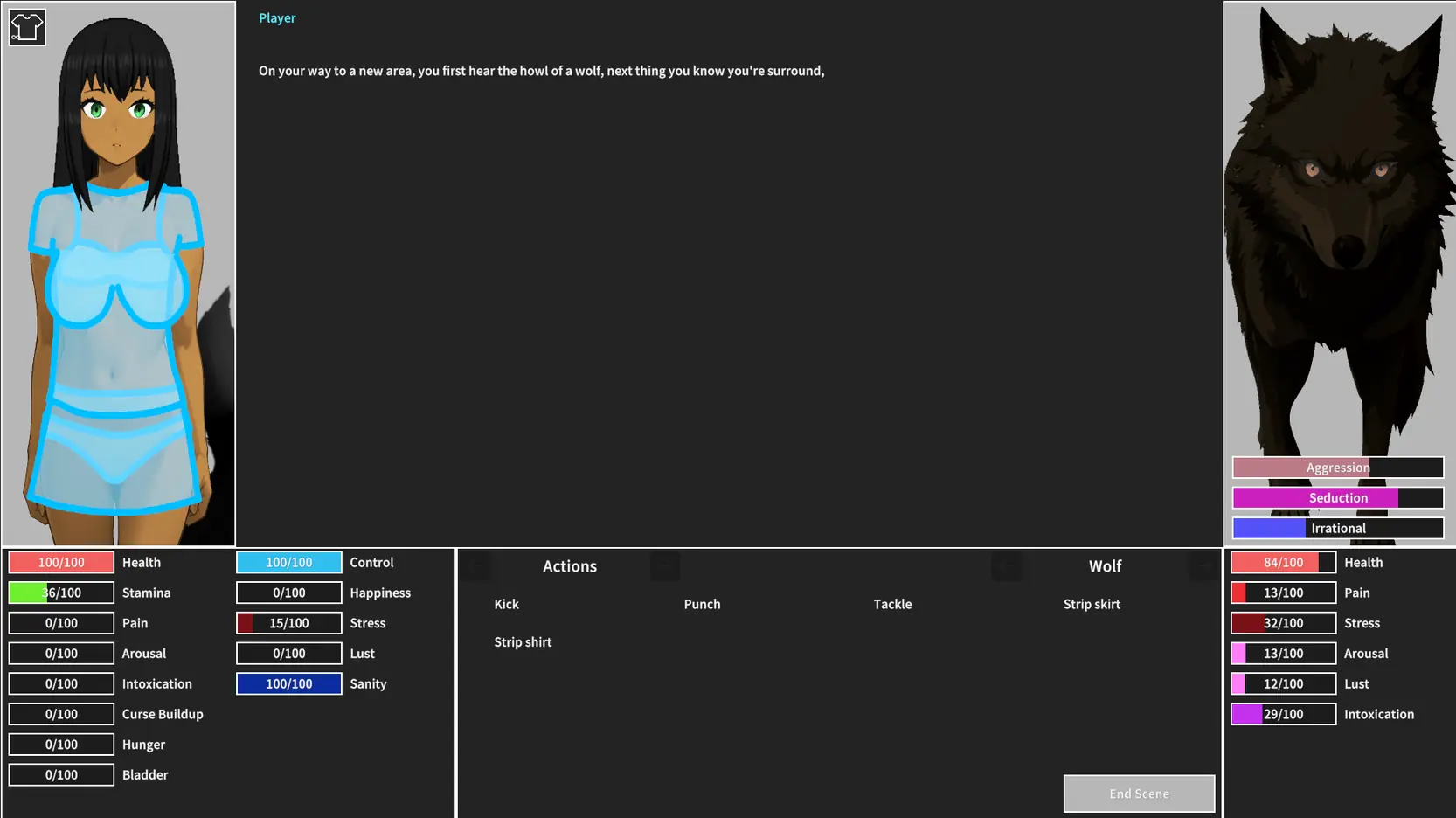 -Wolves will still get the player to jerk them off, not sure if this is a bug or feature, but reads as if its a human doing it.Thirst!