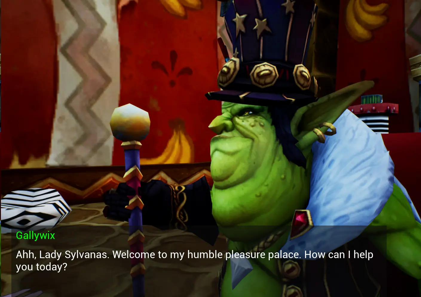 Prototype 1 is a very short third-person game (2-5 minutes) that takes place in a different timeline during Battle for Azeroth at the Gallywix Pleasure Palace. In this game you play as Sylvanas Windrunner, who has to make a deal with Gallywix, where he proposes a certain partnership with her.