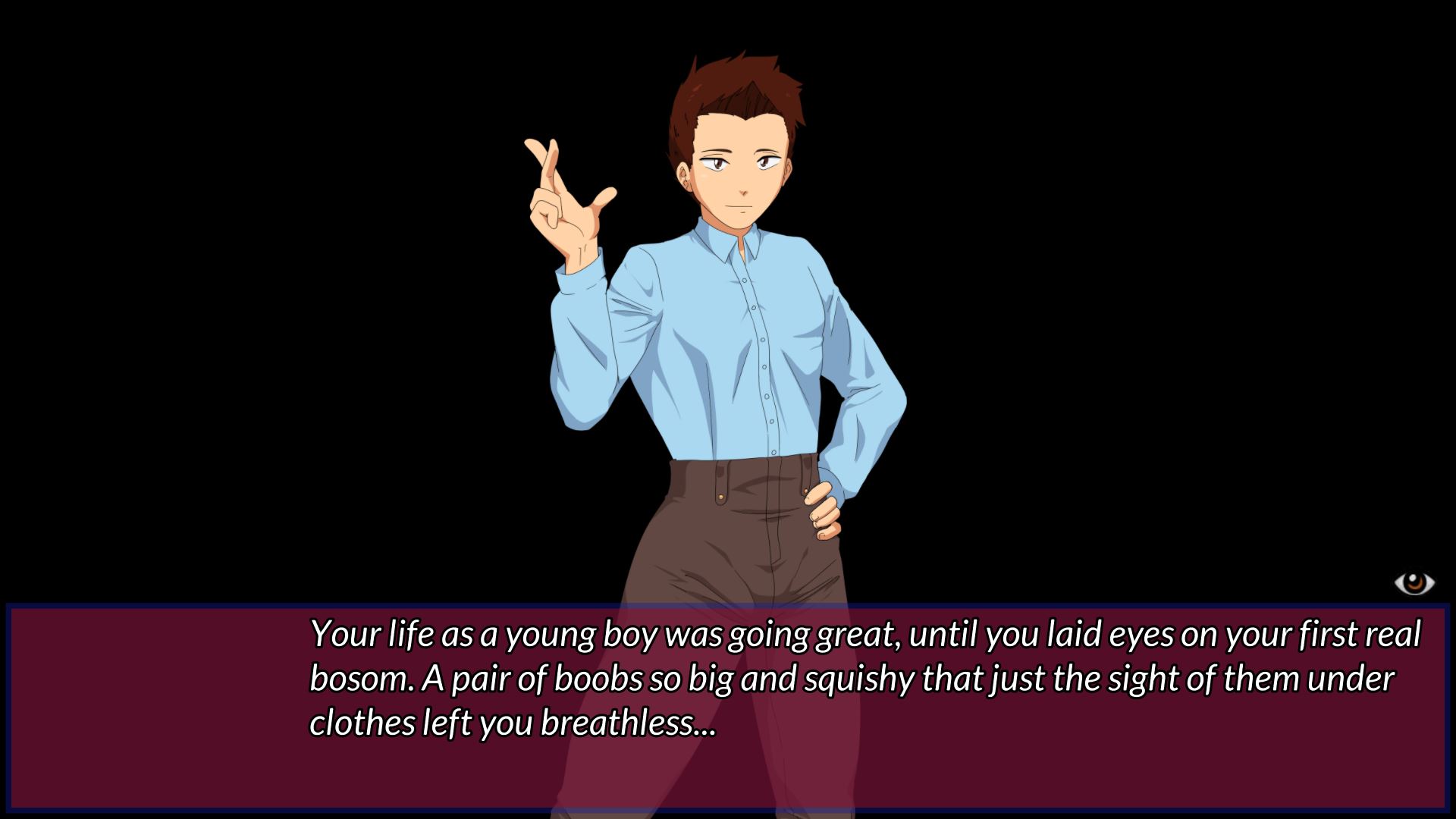 You play as a boy who is diagnosed with an incurable disease: Breastophillia. A disease that caused the sight of breasts to take his breath away. Literally. After word of his affliction spreads to the local youth, fears of spreading the incurable disease throughout the town. He leaves his hometown and old life behind to become an adventurer.