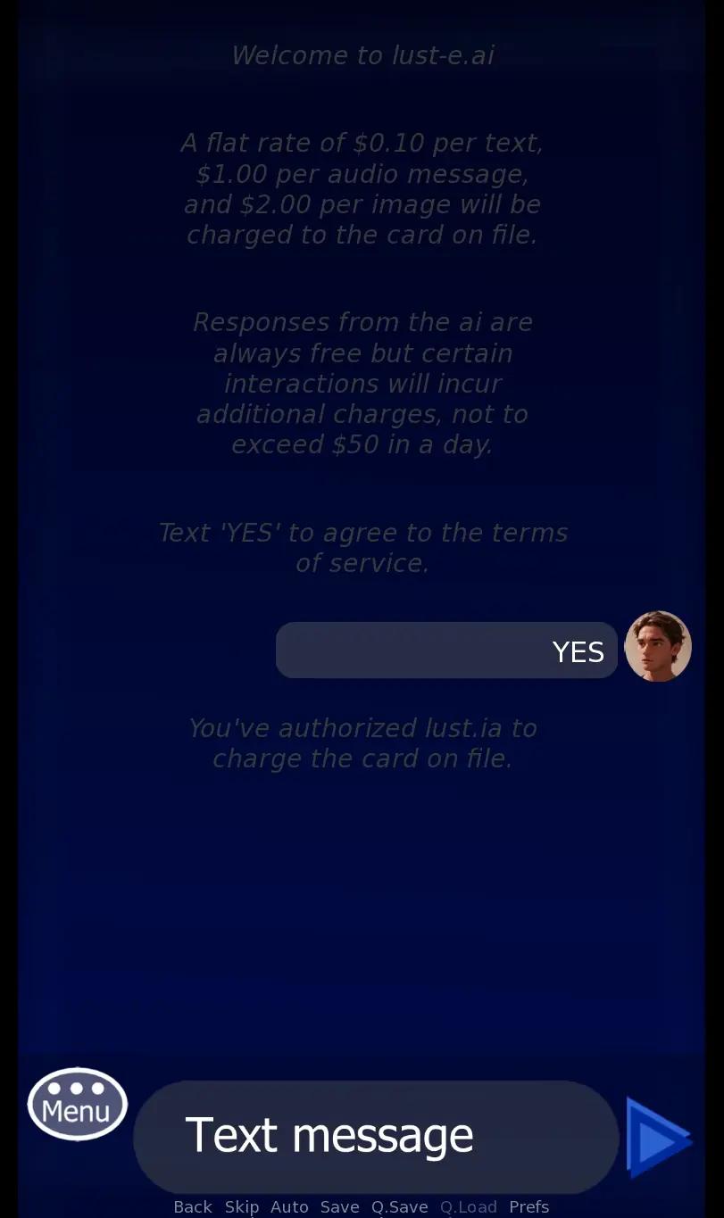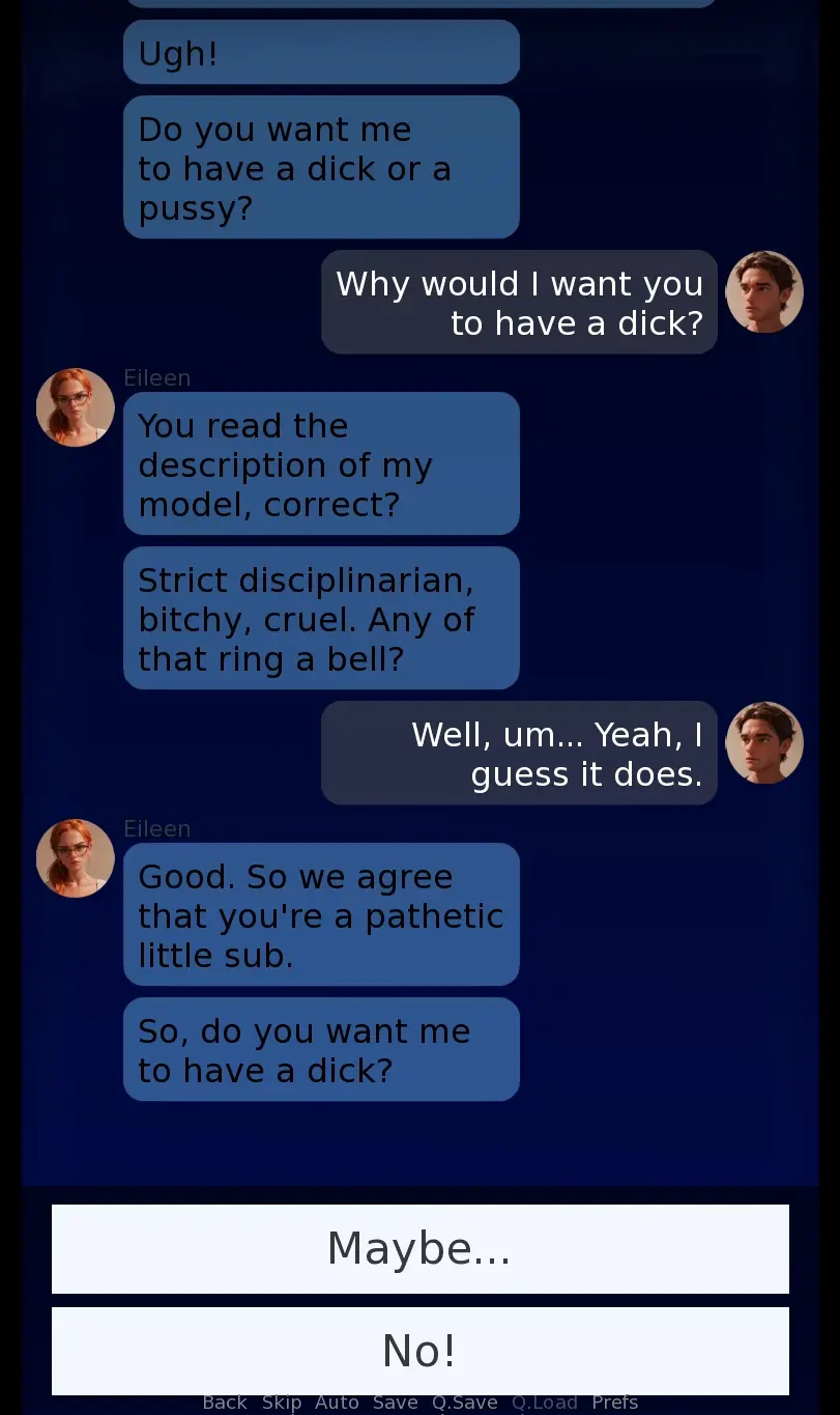 Virtual Authority takes place in the near future where Ai chat bots have become incredibly realistic. You play as a down on his luck masochist that’s giving them a try for the first time, and quickly discover how addictive they can be.